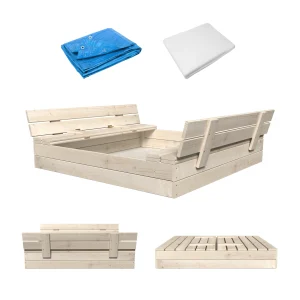 MAMOI Sabbiera con coperchio 120×120 | sabbiera Naturale con panche | Sabbiera in legno con copertura e panche 150×150