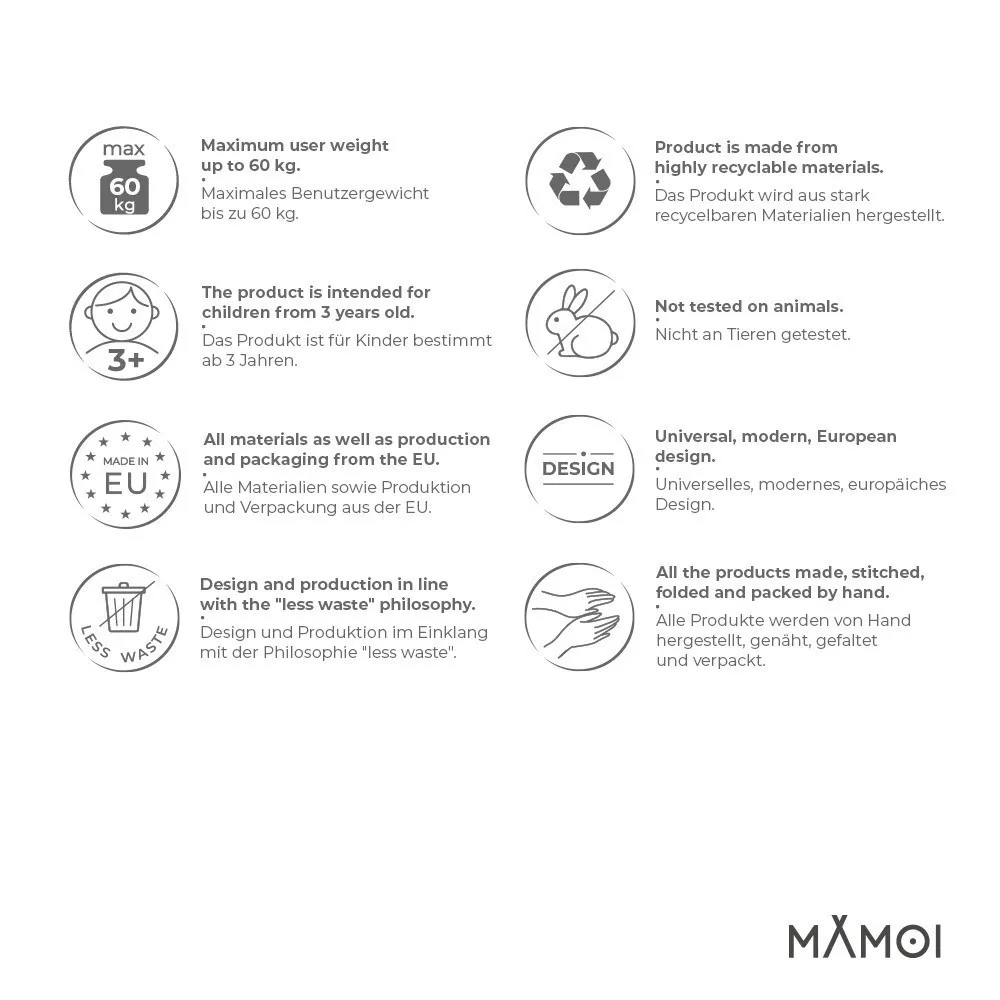L’azienda MAMOI è caratterizzata dall’alta qualità dei suoi prodotti. Questi soddisfano anche i severi requisiti e standard di sicurezza. La borsa appesa per bambini è adatta a qualsiasi stanza come un’altalena per giocare, leggere e rilassarsi. Nel processo di produzione non vengono utilizzati inquinanti chimici, coloranti o detergenti. Un prodotto ecologico. L’altalena da interno per bambini ha un design senza tempo. Il tono rosa neutro si adatta a qualsiasi interno. Il bordo rosa del prodotto sembra leggero e moderno.