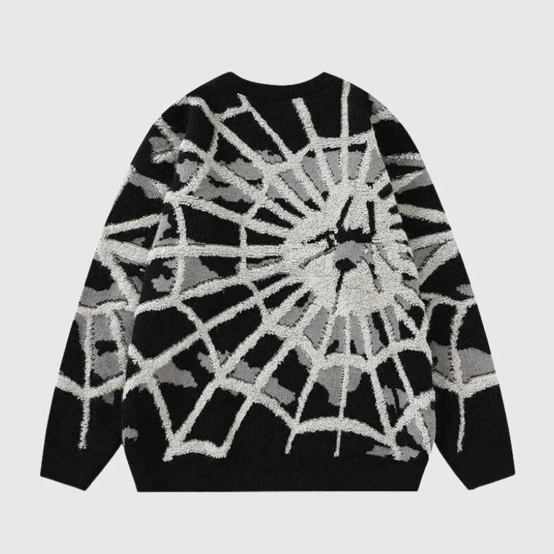 Features: Pullover, crew neck, long sleeve, color contrast, cobweb printed design, vintage, knit, relaxed fit, jacquard weave, couple outfits.