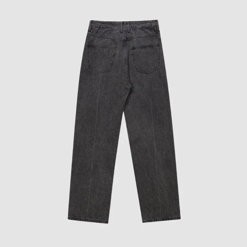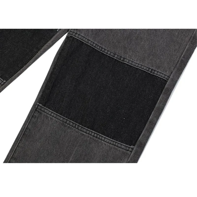 Features: Pants, jeans, distressed, color patchwork design, straight-leg, relaxed fit, unisex, couple outfits.