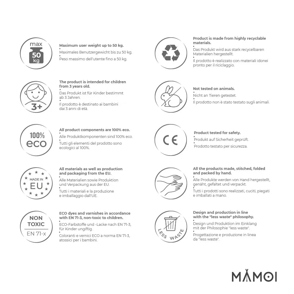 “Il prodotto può essere usato all’esterno, ma dovrebbe essere conservato in un luogo asciutto e pulito. A causa dei materiali naturali, non può essere esposto alle condizioni ambientali difficili, come pioggia o neve. Il produttore non si assume alcuna responsabilità per il mancato rispetto delle condizioni di conservazione contenute nel manuale dei giocattoli.