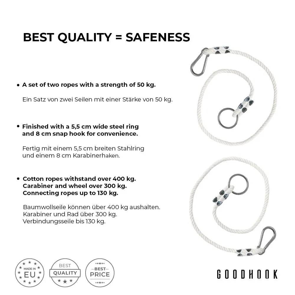 L’utilizzo di funi di prolunga permette di adattare ancora meglio i vari tipi di sedili sospesi alle dimensioni della sala. L’installazione del prodotto è estremamente semplice. Basta fissare la corda con un moschettone. È inoltre possibile utilizzare questo prodotto come un gancio per altalena per montare sedie a balcone o altre altalene come un’amaca, un’altalena per bambini, un’altalena trapezoidale, un seggiolino per bambini o un’altalena per nidi.
