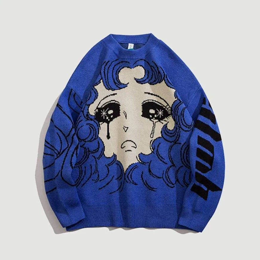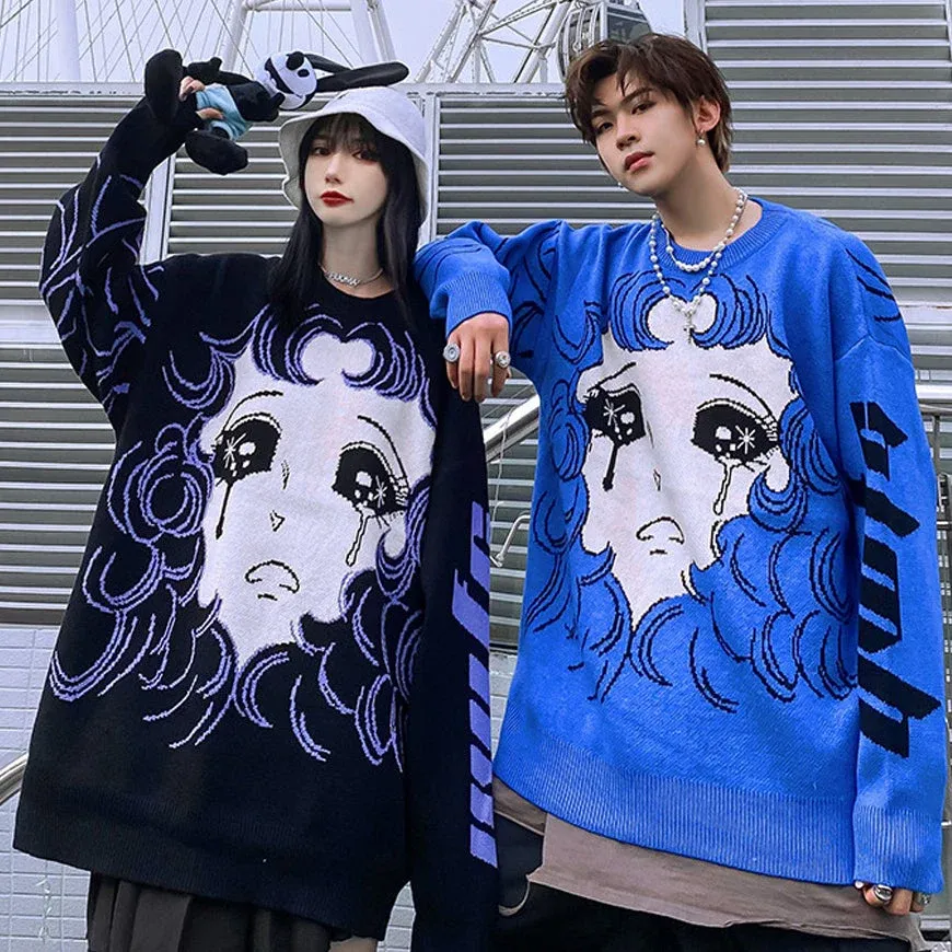 🎯Illustration design of crying comic girl, creating the visual impact of this sweater. It will be eye-catching as a couple’s outfit.