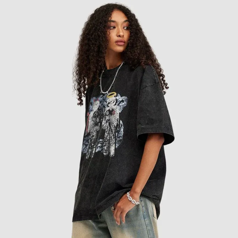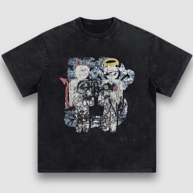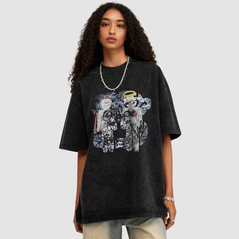 Features: Tee, crew neck, short sleeves, solid color, devil & angel pattern printed, washed, loose fit, soft and breathable, unisex.