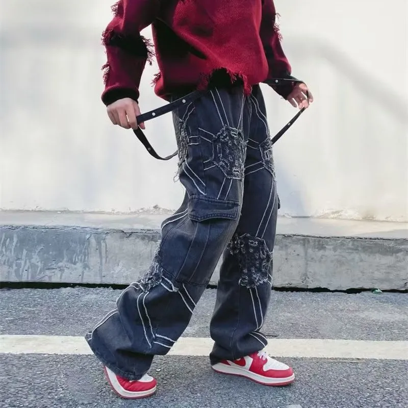 Features: Pants, jeans, spiderweb pattern embroidered, washed, non-elastic, zipper front, solid color, straight-leg, wide leg, strap decoration, relaxed fit, unisex, couple outfits.