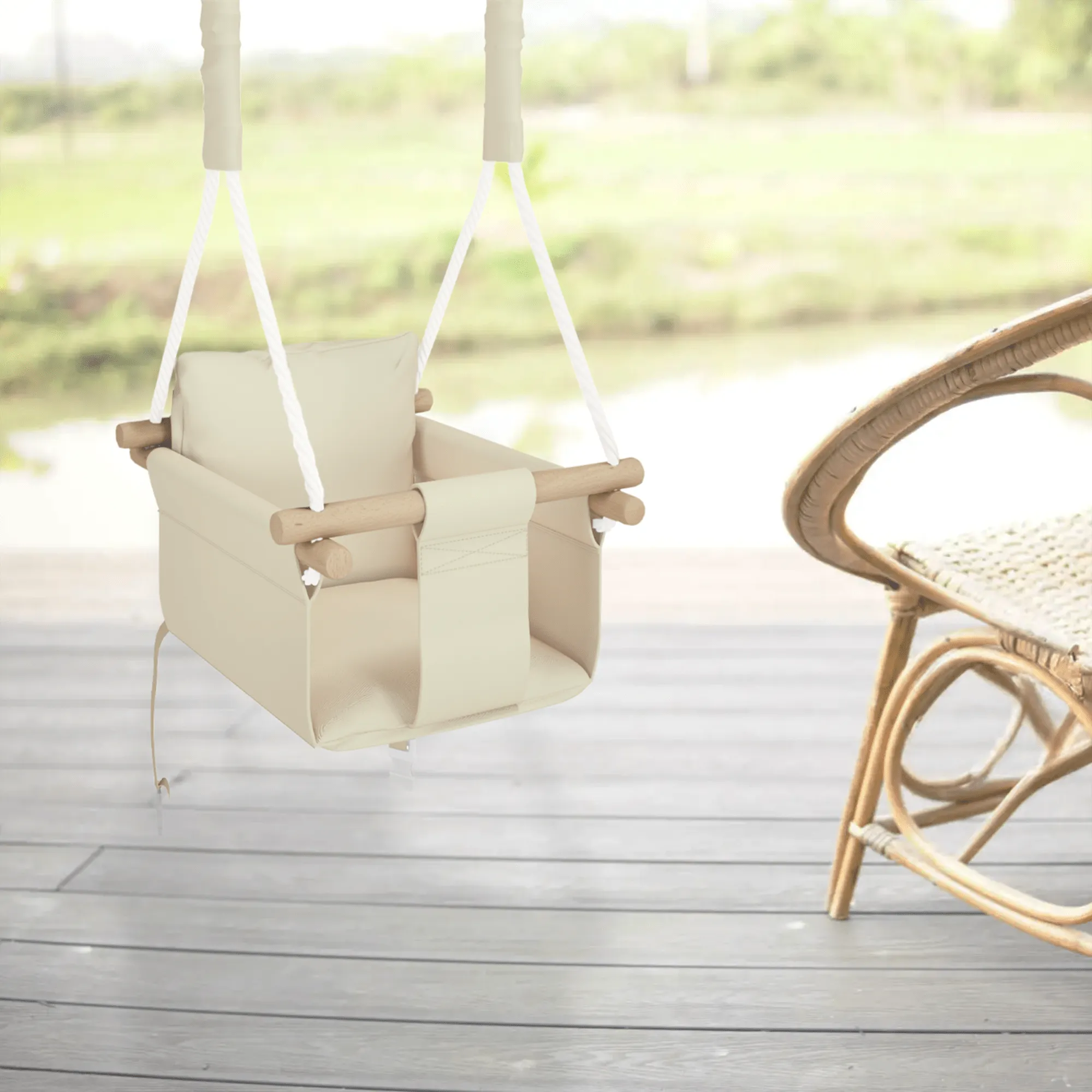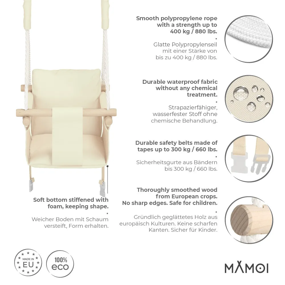 Huśtawka dziecięca do domu i ogrodu MAMOI to połączenie estetyki, trwałości i bezpieczeństwa. Dzięki zastosowaniu wodoodpornej tkaniny typu kodura doskonale sprawdza się zarówno w pomieszczeniach, jak i na zewnątrz – w ogrodzie, na balkonie czy tarasie. Materiał ten nie chłonie wilgoci, jest łatwy w czyszczeniu i odporny na działanie promieni słonecznych, co czyni go idealnym wyborem do codziennego użytku.
