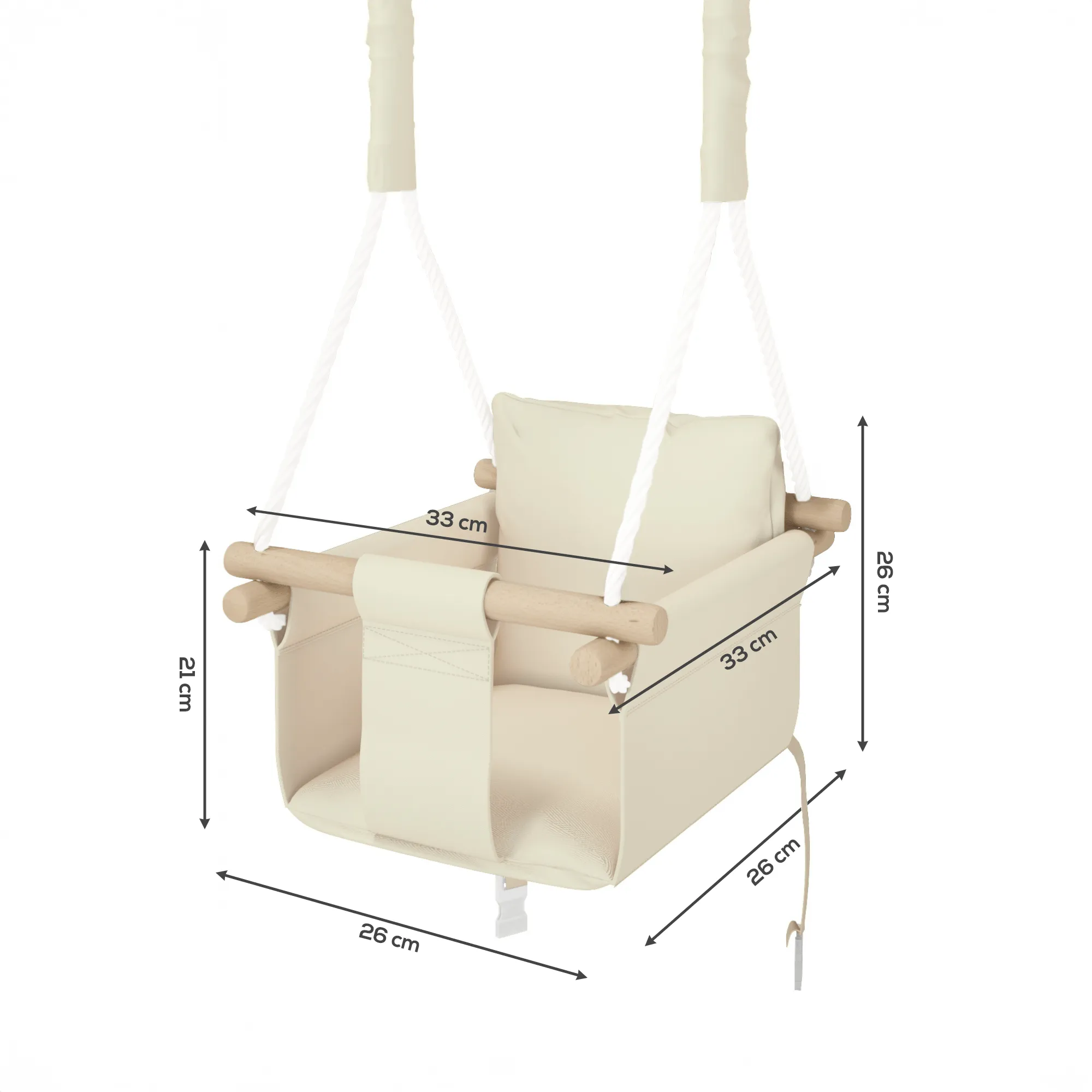 Siedzisko huśtawki zostało wykonane z wysokiej jakości kodury, liny z trwałego polipropylenu, a elementy drewniane zostały starannie polakierowane, co chroni je przed działaniem warunków atmosferycznych i nadaje całości estetyczny wygląd. Konstrukcja jest solidna i zaprojektowana z myślą o bezpieczeństwie najmłodszych użytkowników. Wszystkie krawędzie są gładkie, a montaż huśtawki prosty i intuicyjny – wystarczy zawiesić ją na odpowiednim uchwycie lub gałęzi.