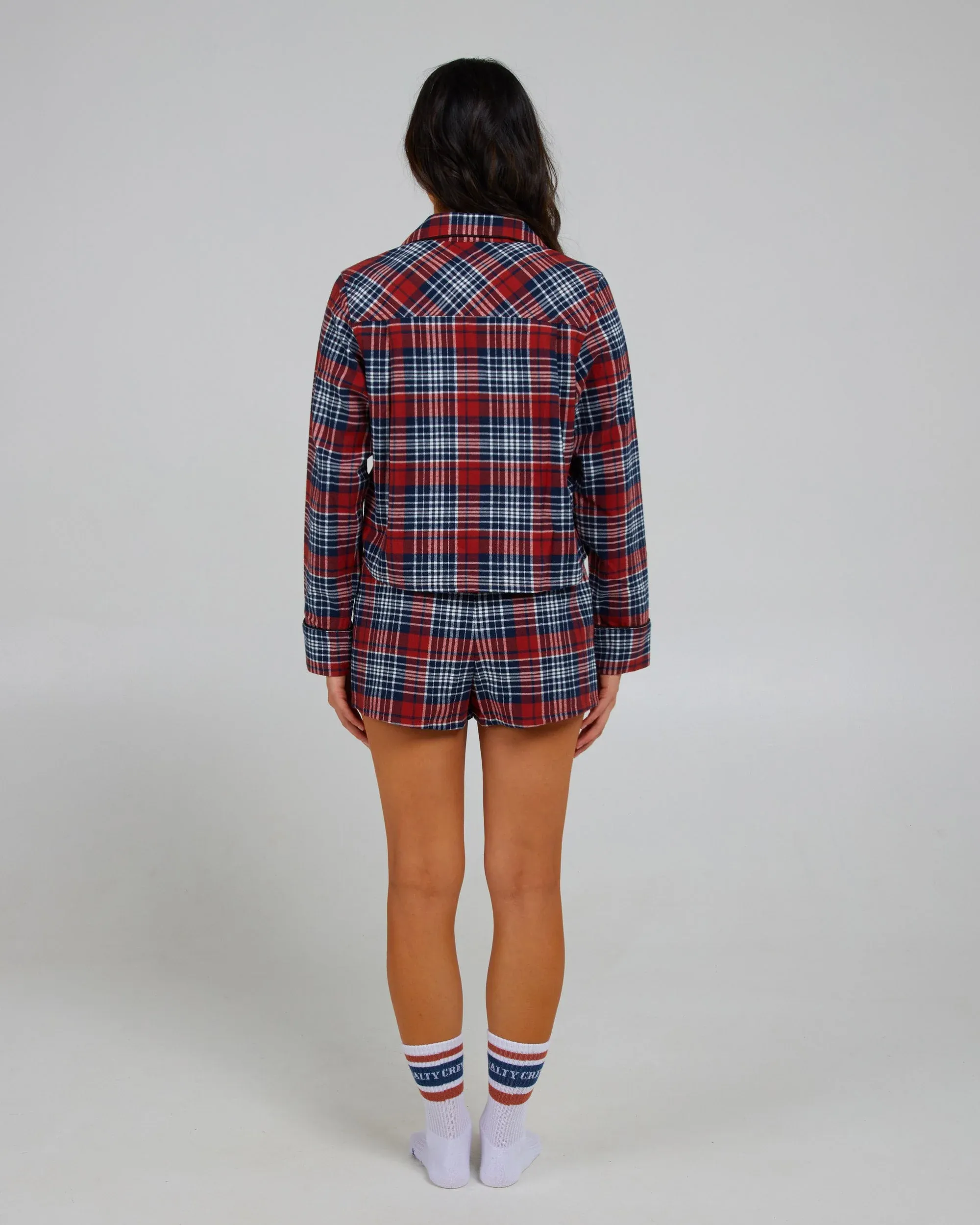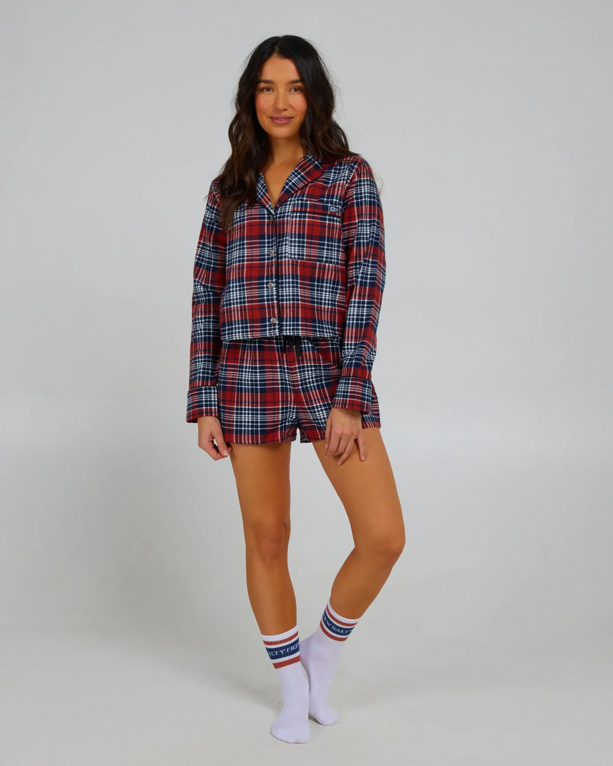 - Cropped button front pajama top with satin piping and patch pocket