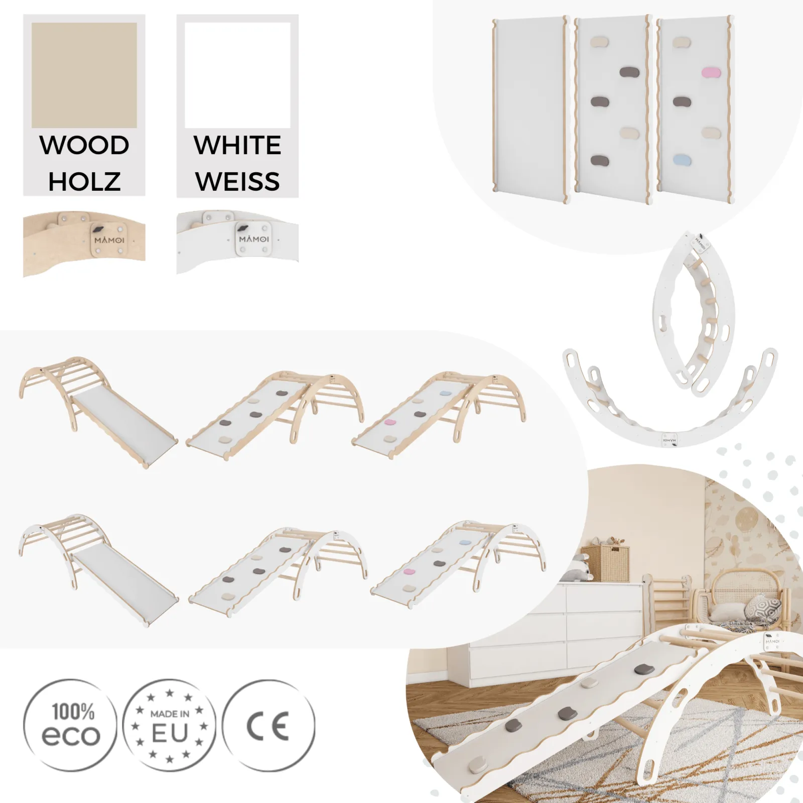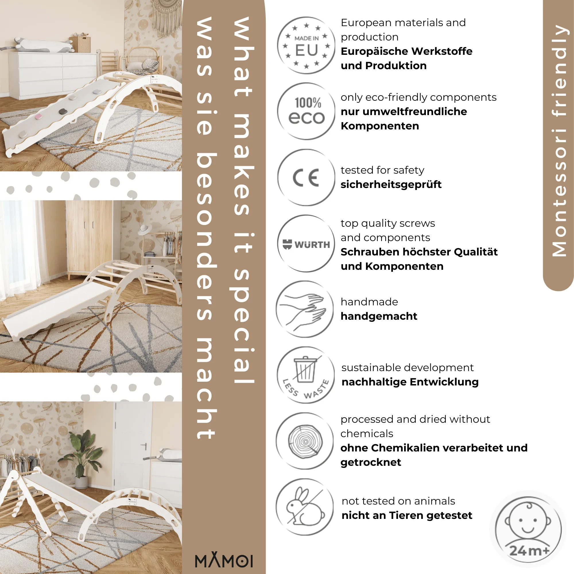 Conosciuto anche come: scivolo per bambini 1 anno, scivolo per bambini 2 anni, montessori 1 anno, rainbow rocker, triangolo pikler montessori, scivolo montessori per bambini, altalena per bambini, altalena in legno