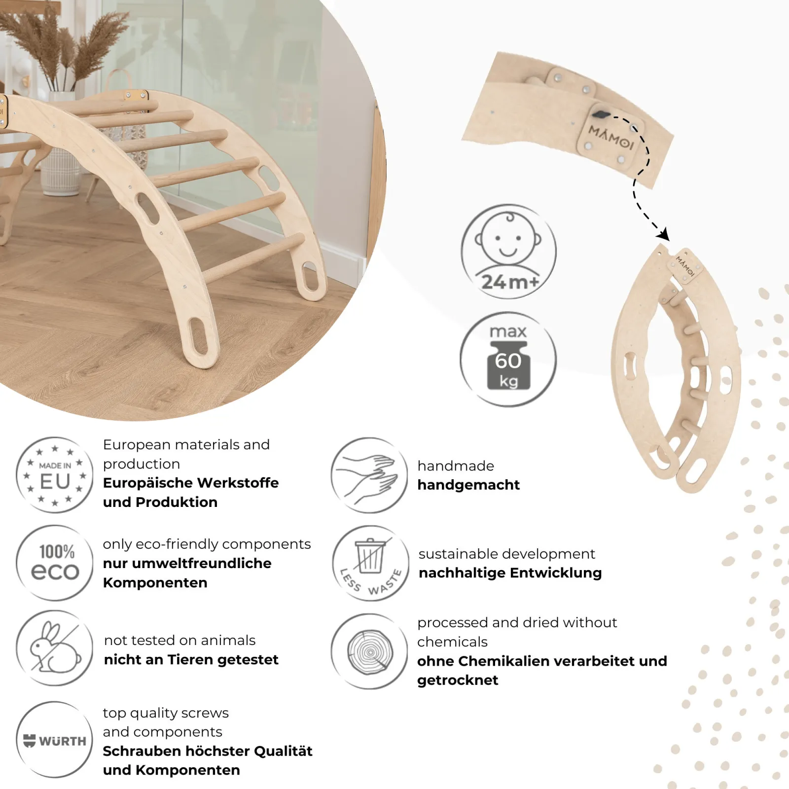 Il arrampicata per bambini è un prodotto progettato per i bambini più piccoli e per il sostegno del loro sviluppo psicomotorio. Il marchio MAMOI punta ai materiali ecologici ed alla fabbricazione di alta qualità, in modo che nelle mani dei consumatori arrivano soltanto i migliori prodotti che soddisfano i rigidi standard europei.