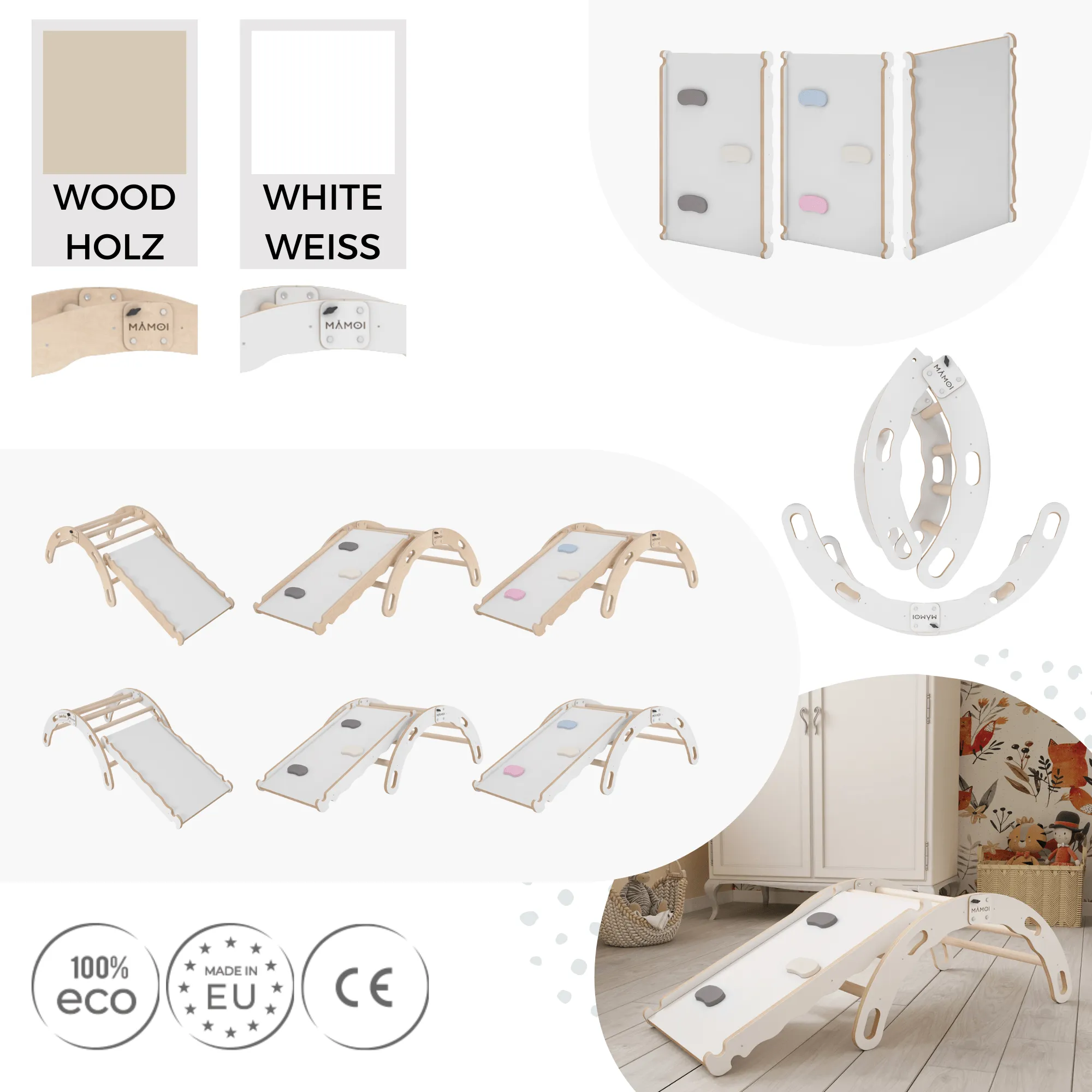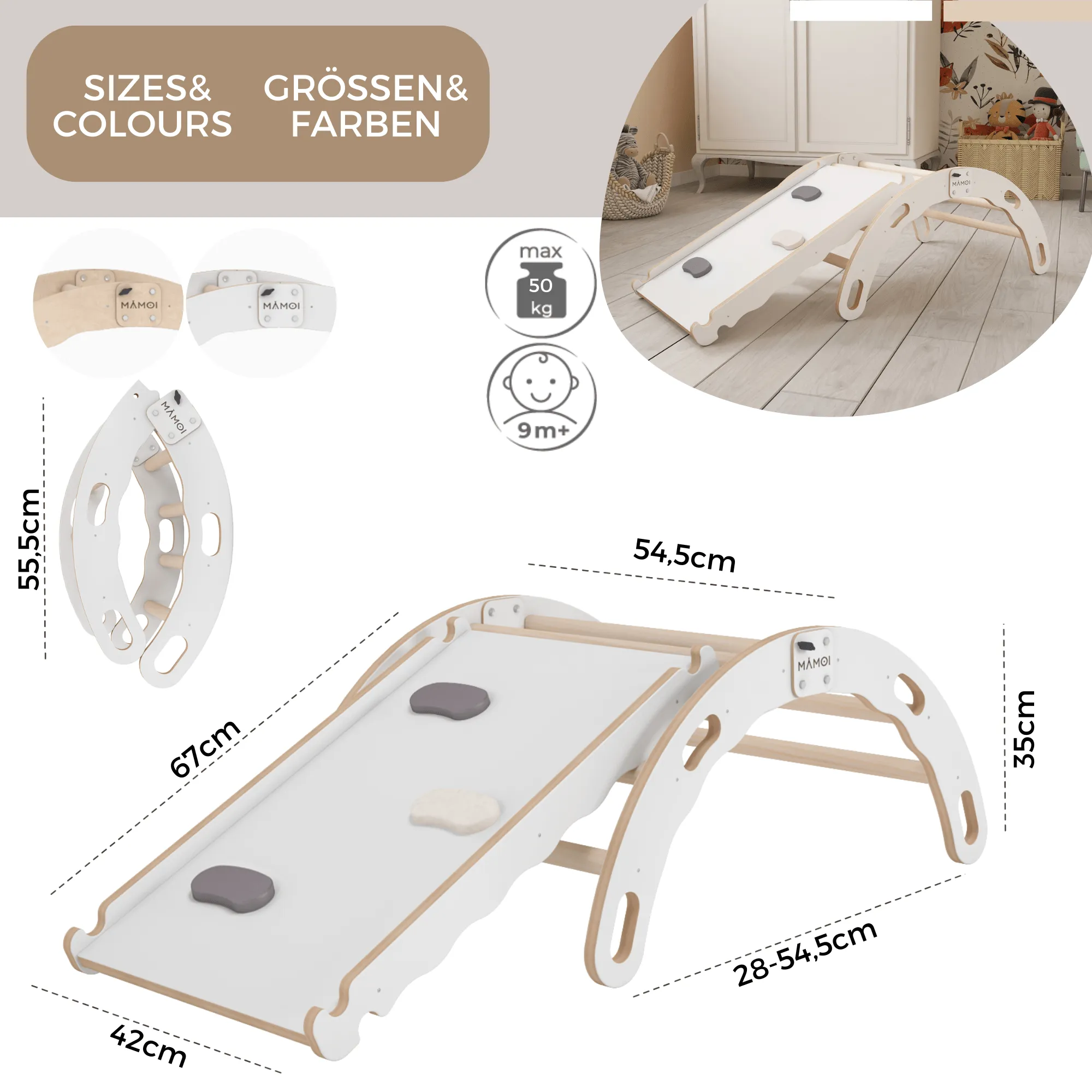 Zabawka 2w1 (w zależności od ustawienia): drewniana drabinka dla dzieci lub zjeżdżalnia drewniana dla dzieci. Stelaż wykonany jest z naturalnego drewna bukowego oraz drewnianej Yarnwood. Kierując łuk w górę otrzymuje się wieżę wspinaczkową, a obracając zabawkę, można wykorzystać ją jak kołyskę na biegunach. Wyposażony w cztery uchwyty, przy pomocy których zabawka może być z łatwością przenoszona i bujana. Do zabawki dołączona jest zjeżdżalnia drewniana dla dzieci. Element można szybko zdjąć i założyć. Blokuje się na szczebelkach przy pomocy precyzyjnie wyciętych elementów. Można regulować ustawienie i wysokość zjeżdżalni. Surowce są zabezpieczane przy pomocy ekologicznych produktów, które są nieszkodliwe dla dzieci oraz dla środowiska. Prosty design sprawdzi się w każdym pomieszczeniu oraz na zewnątrz. Wszystkie elementy są starannie wycinane (CNC) oraz wykończone, dzięki czemu są pozbawione zadziorów i drzazg.