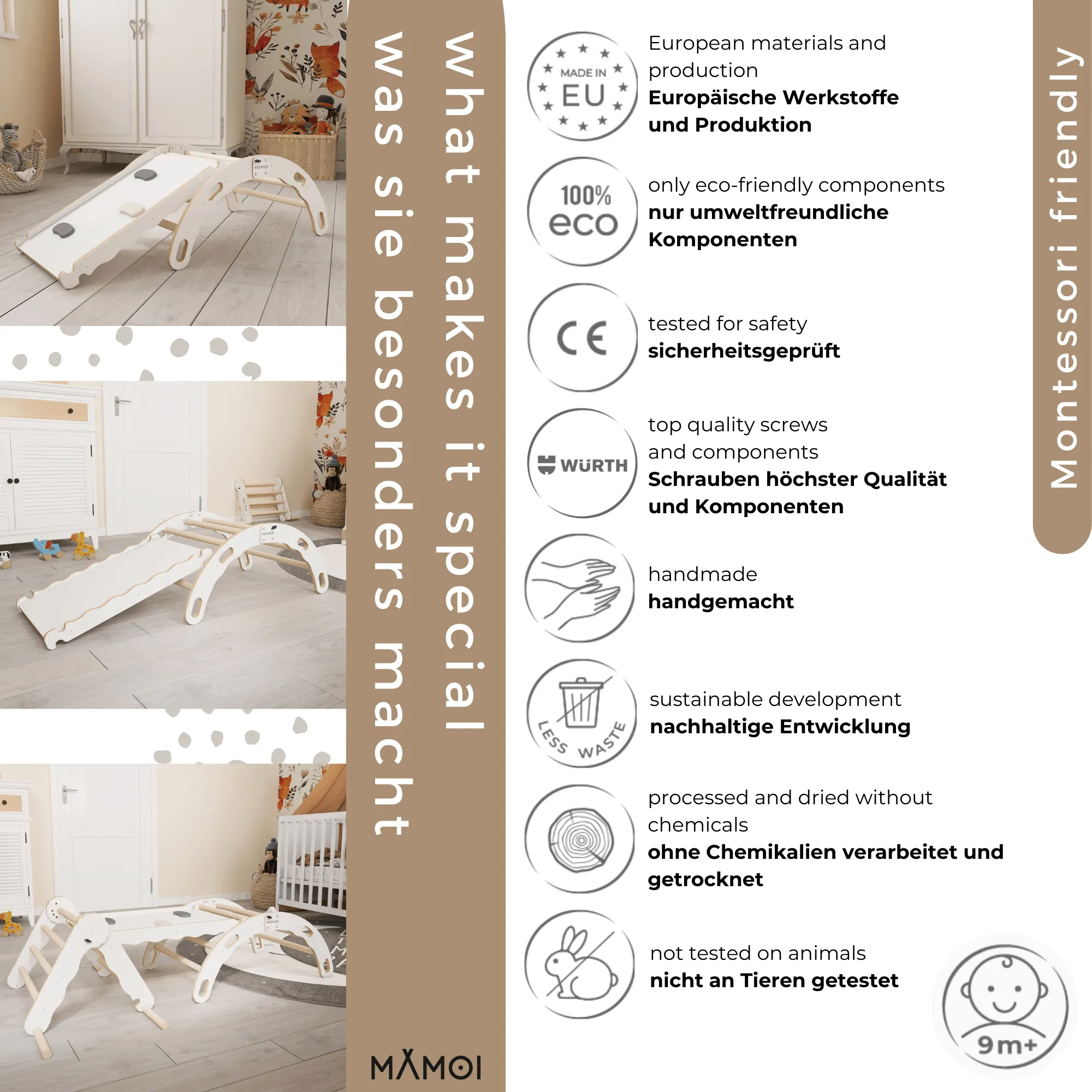 Bujak drewniany dla dzieci ze zjeżdżalnią to produkt zaprojektowany z myślą o najmłodszych dzieciach i wspieraniu ich rozwoju psychoruchowego. Marka MAMOI stawia na ekologiczne materiały oraz wysokiej jakości wykonanie, dzięki czemu w ręce klienta trafiają wyłącznie najlepsze produkty, spełniające rygorystyczne europejskie normy.