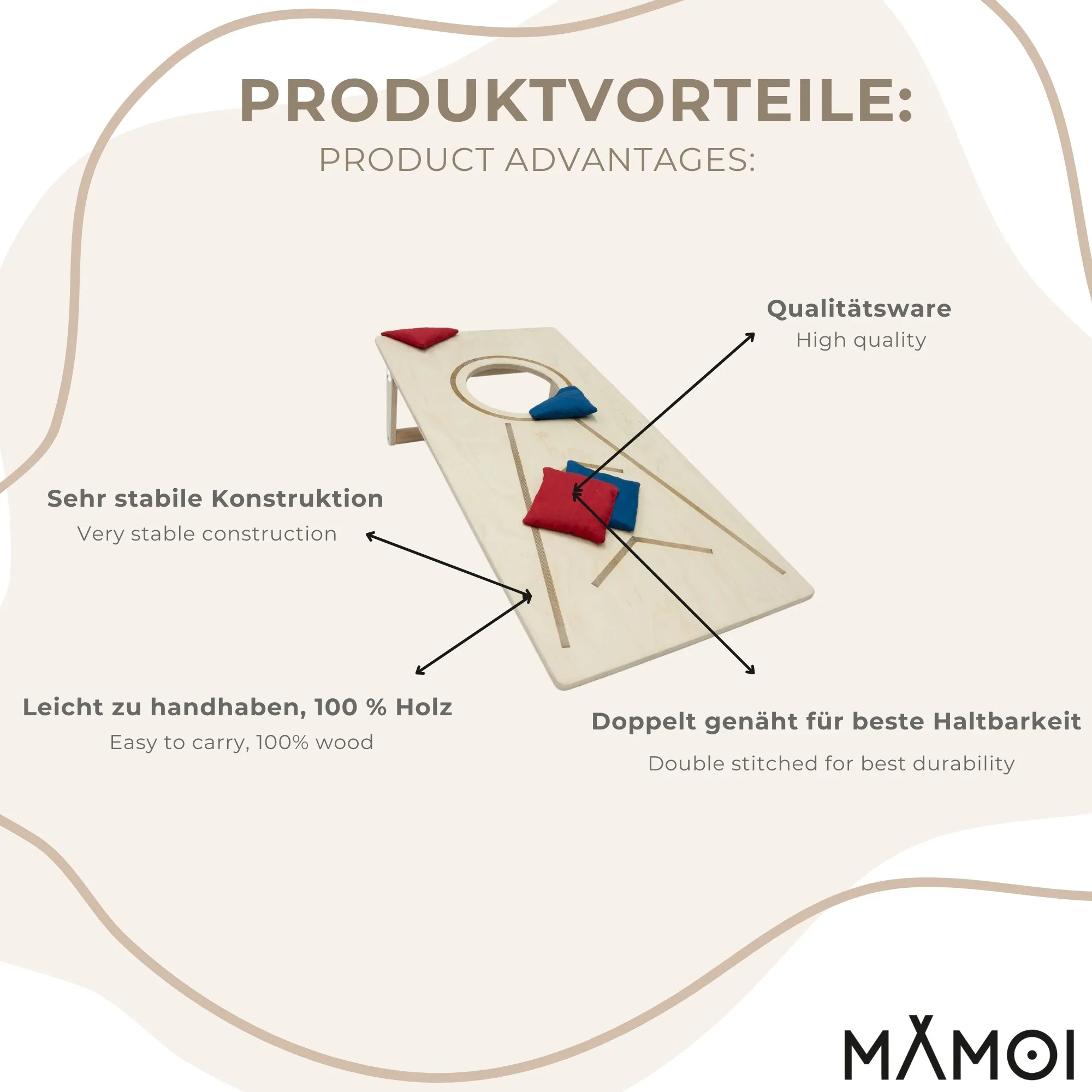 Il Cornhole è il gioco di lancio ideale per l’interno e l’esterno, che piacerà a bambini e adulti. Promuove la destrezza e regala ore di divertimento in diverse occasioni, in giardino, in spiaggia o al parco. Il set è composto da una tavola di legno robusta e resistente e da otto sacchi da lancio che rimangono affidabili anche con un uso intensivo. Grazie alle dimensioni compatte e alla struttura leggera, il gioco è facile da trasportare e veloce da montare: perfetto per le partite spontanee e le serate in compagnia. Le semplici regole lo rendono facilmente comprensibile a tutti, così il divertimento può iniziare immediatamente.