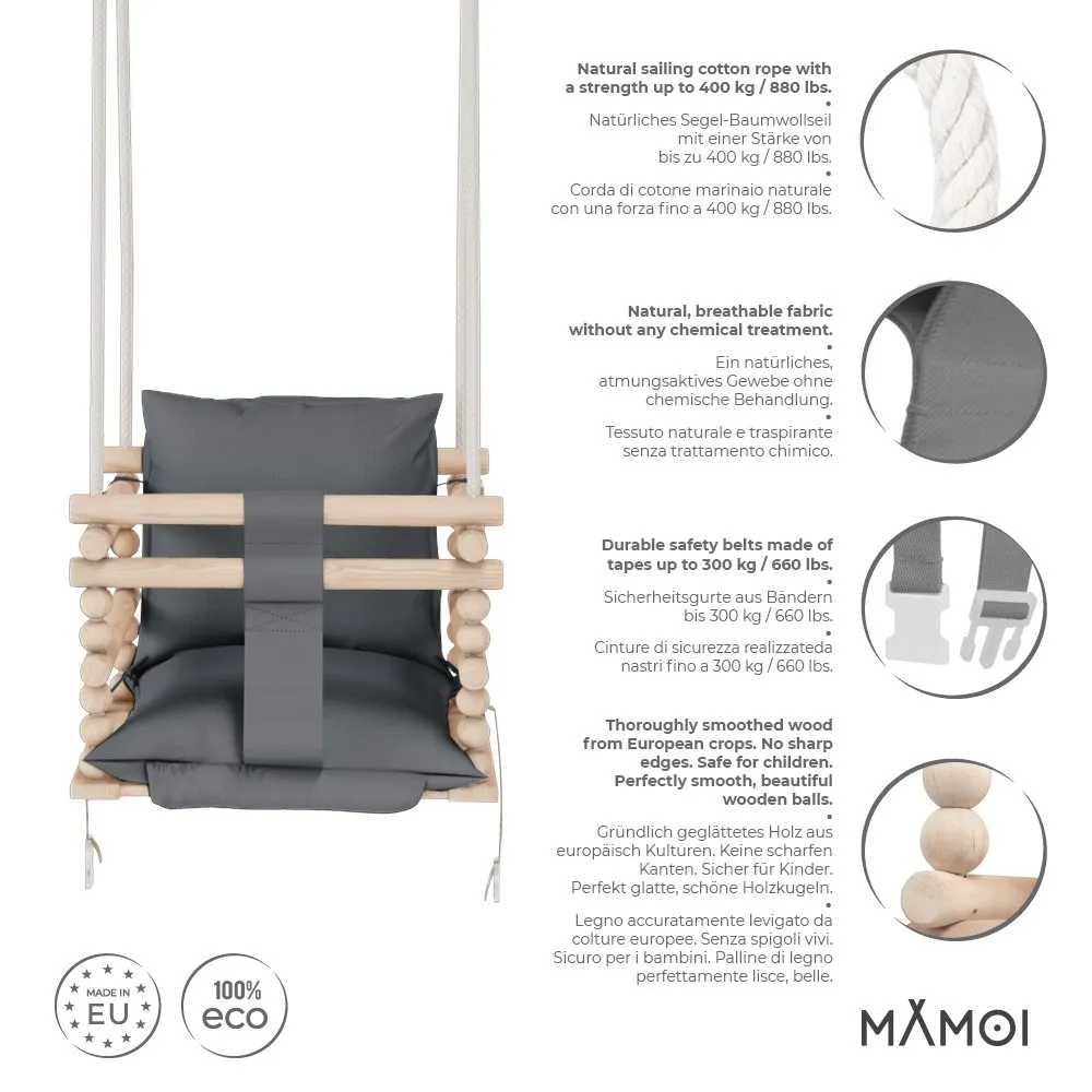 Nella produzione non sono stati utilizzati né materiali chimici o tossici né allergeni. L’altalena MAMOI è completamente sicura per i bambini piccoli e grandi.