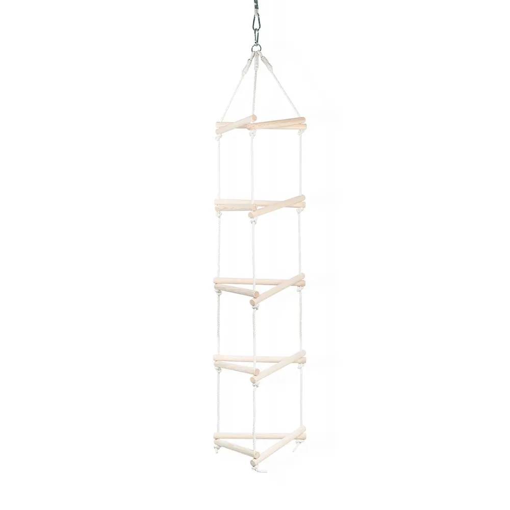 Drabina wisząca jest gotowa do użytku. Szczeble opierają się supłach na linie. Do dyspozycji dziecka jest aż 15 szczebelków, ułożonych w 5 poziomach, w odstępach 30 cm od siebie. Konstrukcja mocowana jest na metalowym kółku i wytrzymałych karabińczykach.”