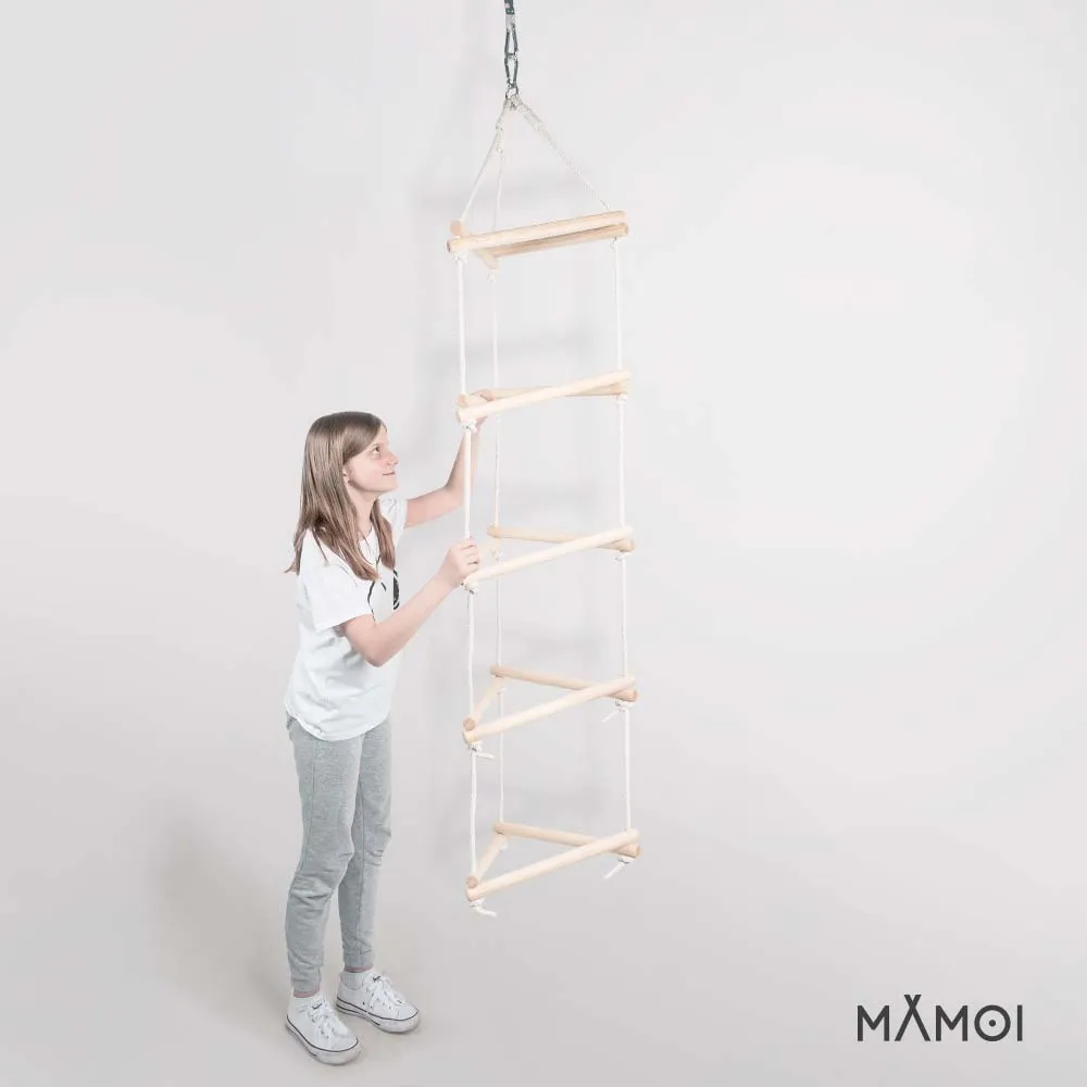 Drabinka linowa dla dzieci MAMOI wykonana jest z drewnianych szczebelków połączonych wytrzymałą liną marynarską. Drabinka jest odpowiednia dla dzieci powyżej 3. roku życia. Konstrukcja utrzyma obciążenie do 50 kg. Produkt spełnia surowe wymagania bezpieczeństwa EN i CE. Zabawa na drabince pomaga wzmacniać mięśnie, a także wspiera prawidłowy rozwój psychoruchowy dziecka. Drabinka może być zamocowana pod sufitem, na szczeblach drabinki ściennej lub na przeznaczonym do tego uchwycie montażowym.