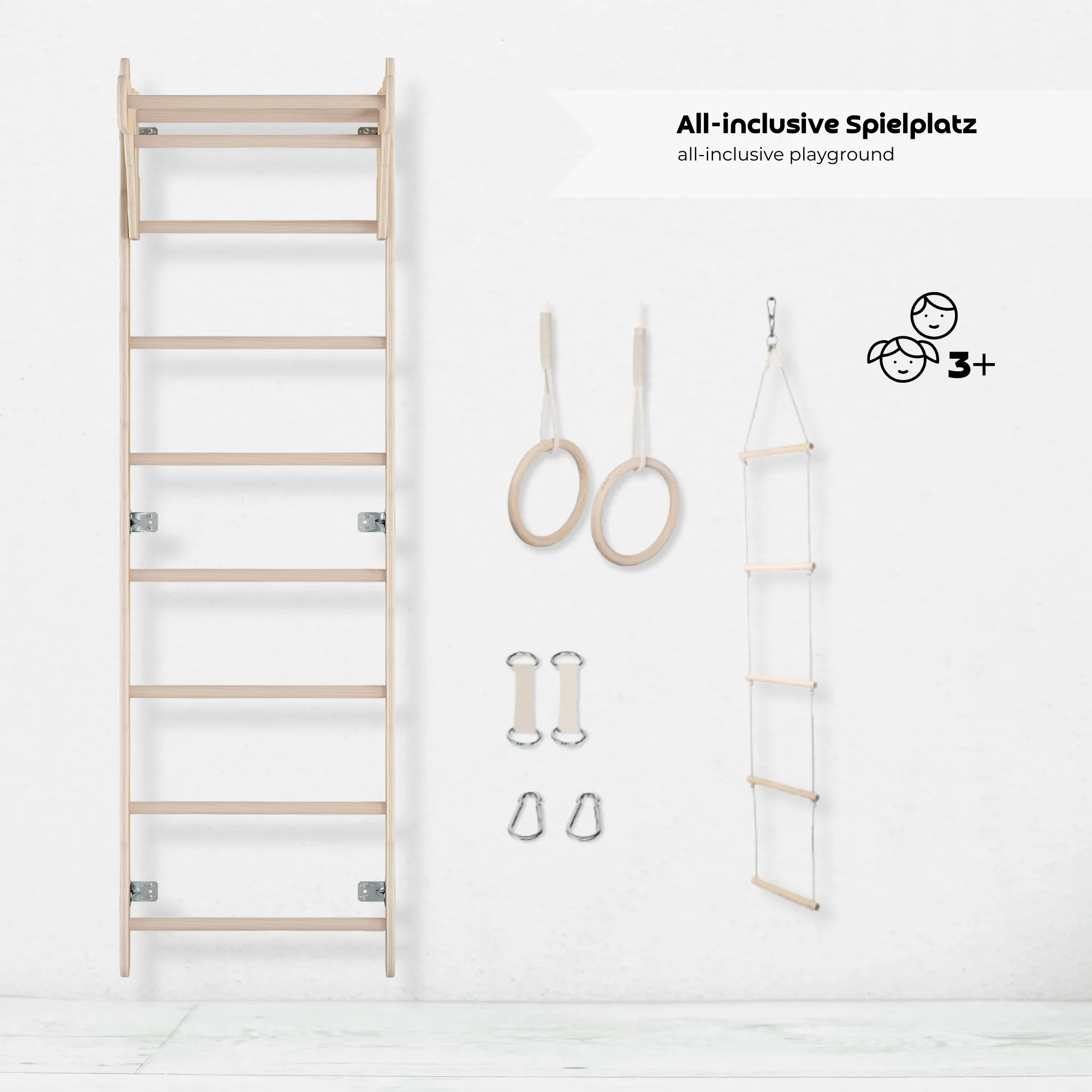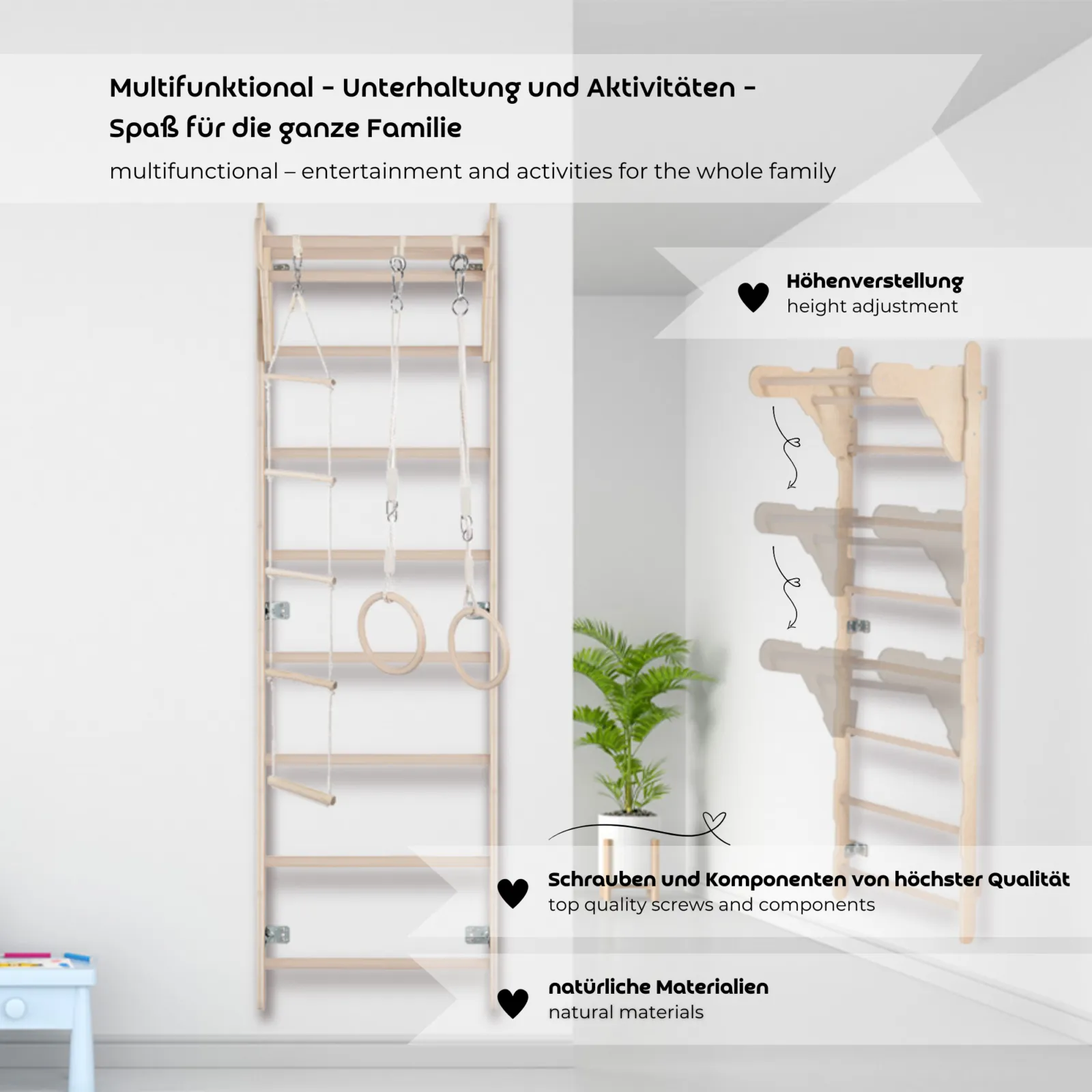 MAMOI® Drabinka gimnastyczna dziecięca (210 cm) | Drabinka treningowa naścienna | Drabinka linowa dla dzieci | Drewniany plac zabaw do domu | Kółka gimnastyczne | 100% ECO | Made in UE