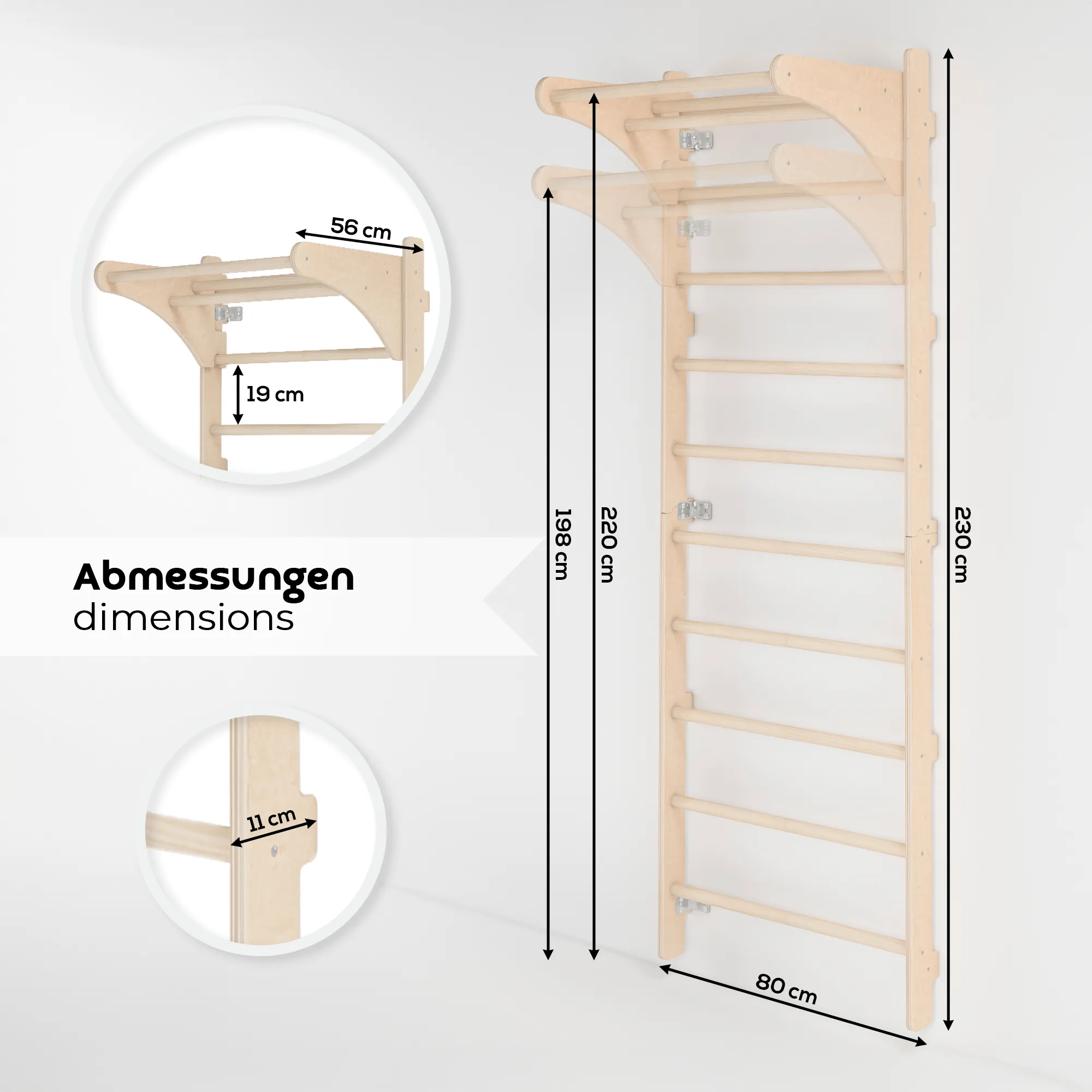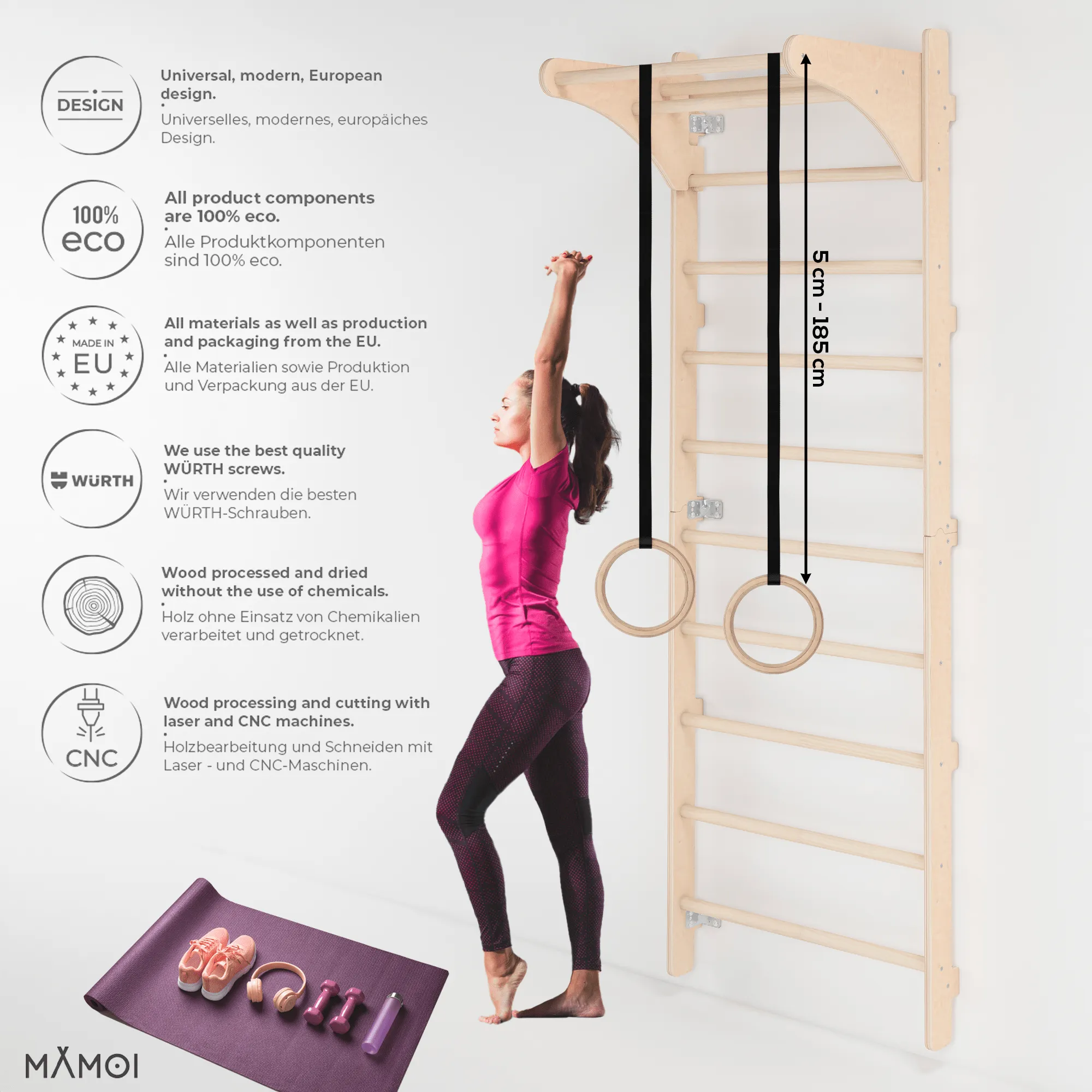 MAMOI® Drabinka gimnastyczna naścienna z kółkami gimnastycznymi, regulacja długości, do ćwiczeń w domu, dla dorosłych i dzieci, trening siłowy i rozciągający, 100% drewno, Made in EU