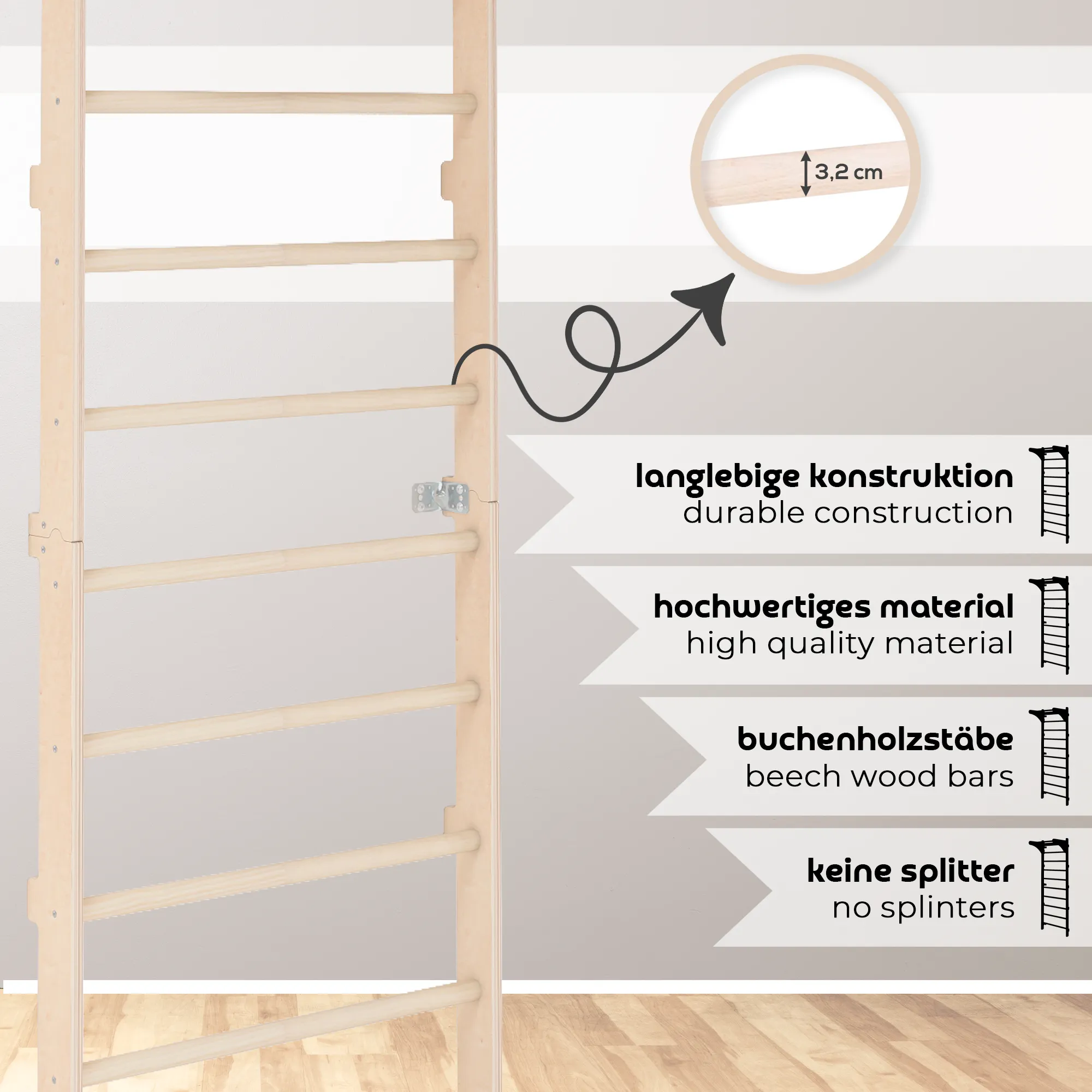 Drabinka gimnastyczna naścienna z uchwytem do podciągania to nowoczesne rozwiązanie, które sprawdzi się zarówno w domowej siłowni, klubie fitness, jak i w pokoju dziecięcym. Jej solidna konstrukcja, stabilne mocowania ścienne i wysokiej jakości materiały zapewniają bezpieczeństwo oraz komfort użytkowania. To wielofunkcyjny sprzęt łączący cechy profesjonalnego narzędzia treningowego i elementu rekreacyjnego. Dzięki trwałemu drewnu i solidnym kątownikom montażowym drabinka gwarantuje wyjątkową stabilność oraz odporność na intensywne użytkowanie. Bukowe szczeble zapewniają pewny chwyt i wygodę podczas ćwiczeń. Uchwyt do podciągania rozszerza zakres treningowy, umożliwiając skuteczne wzmacnianie górnych partii ciała. Możliwość zastosowania dodatkowych akcesoriów, takich jak taśmy TRX, ekspandery czy kółka gimnastyczne, sprawia, że sprzęt dopasowuje się do różnych potrzeb użytkowników. Produkt ten doskonale sprawdzi się także dla dzieci, wspierając ich rozwój motoryczny, koordynację i siłę. Współczesny tryb życia ogranicza aktywność najmłodszych, dlatego drabinka jest świetnym sposobem na zachęcenie ich do ruchu w domowym zaciszu. Możliwość rozbudowy o dodatkowe elementy sprawia, że sprzęt dostosowuje się do potrzeb całej rodziny. Kompaktowy design i eleganckie drewniane wykończenie pozwalają na dopasowanie drabinki do każdego wnętrza. Intuicyjny montaż sprawia, że drabinka jest gotowa do użytku w krótkim czasie. To inwestycja, która rośnie razem z użytkownikami, zapewniając zdrową aktywność dzieciom i dorosłym oraz pełniąc funkcję estetycznego i praktycznego elementu wyposażenia domu.