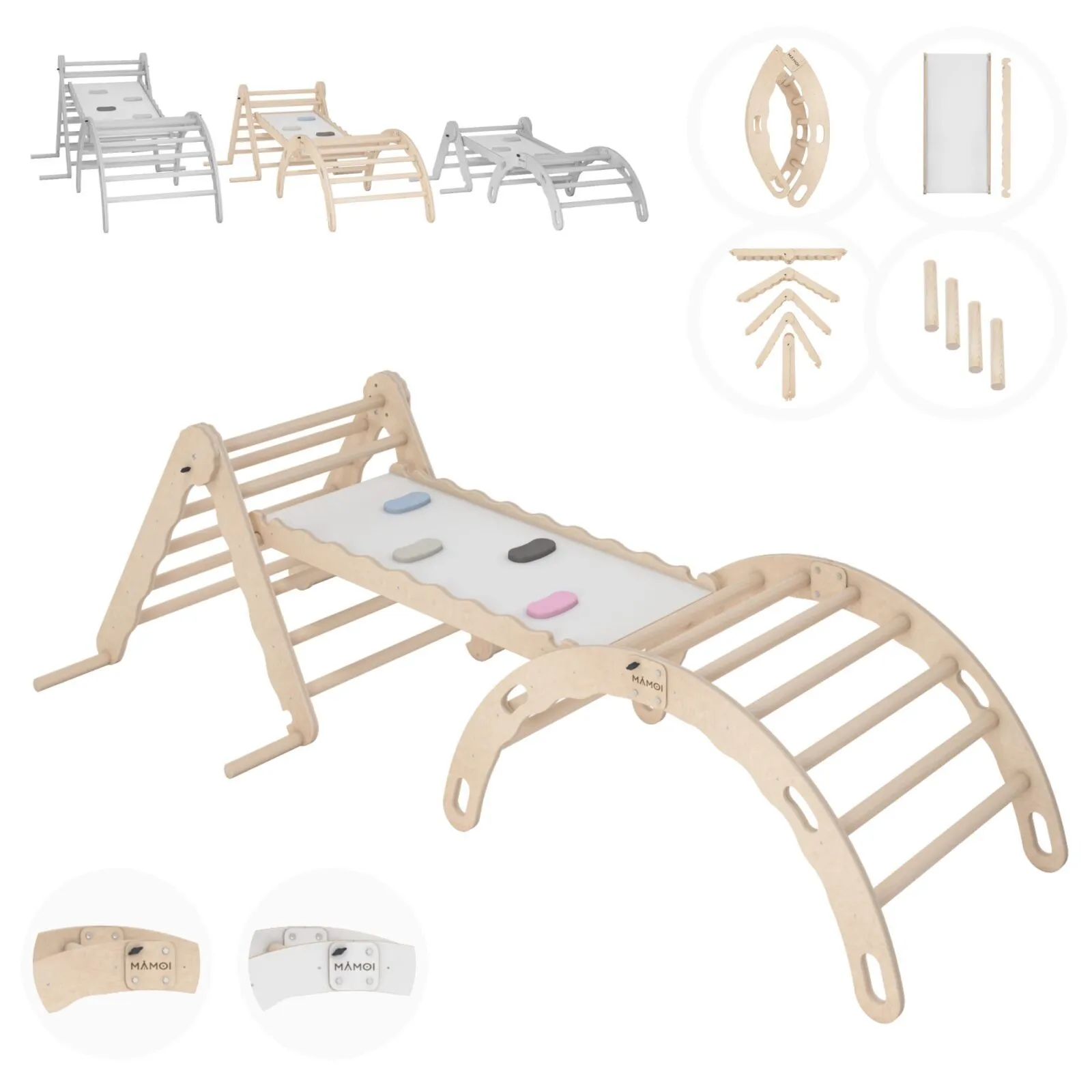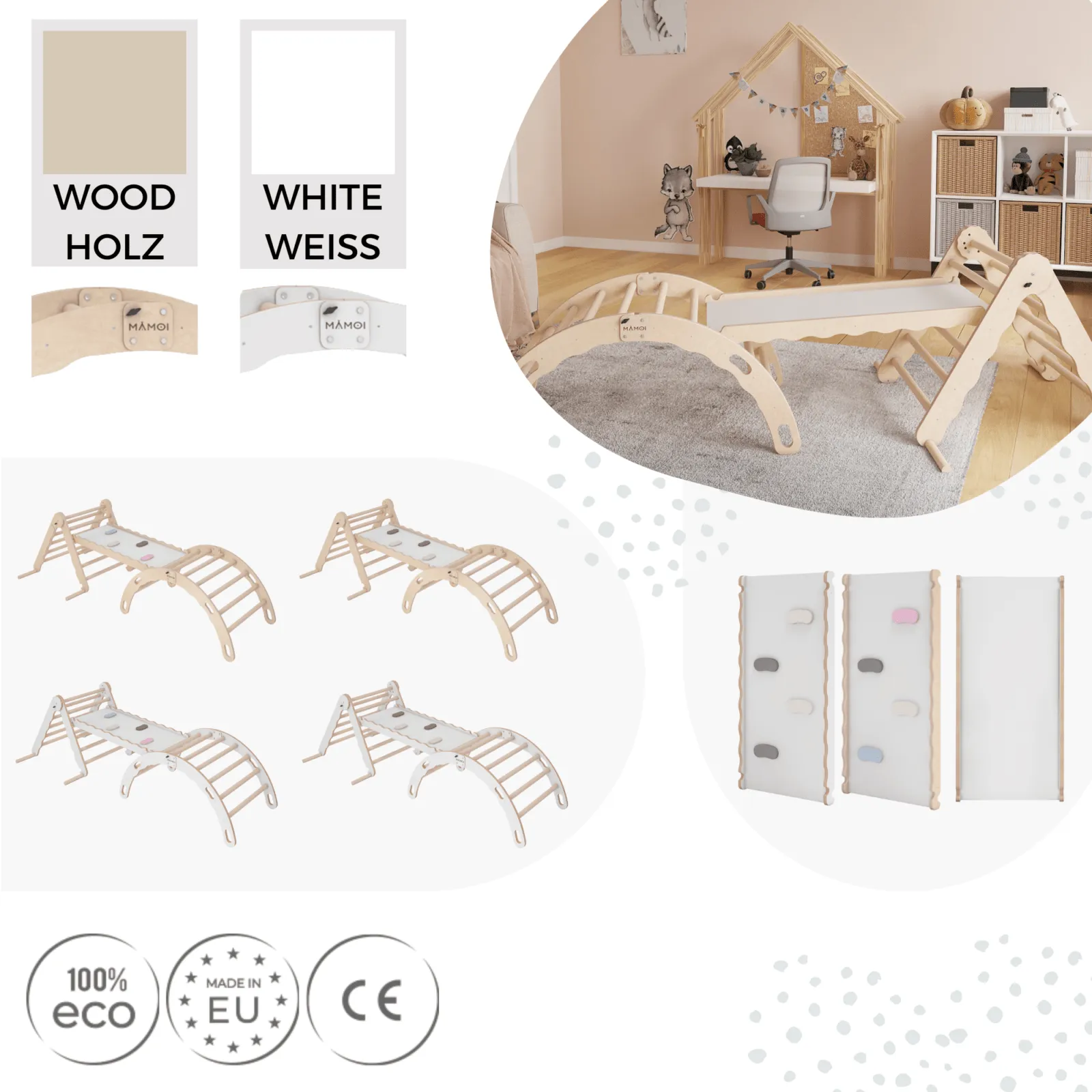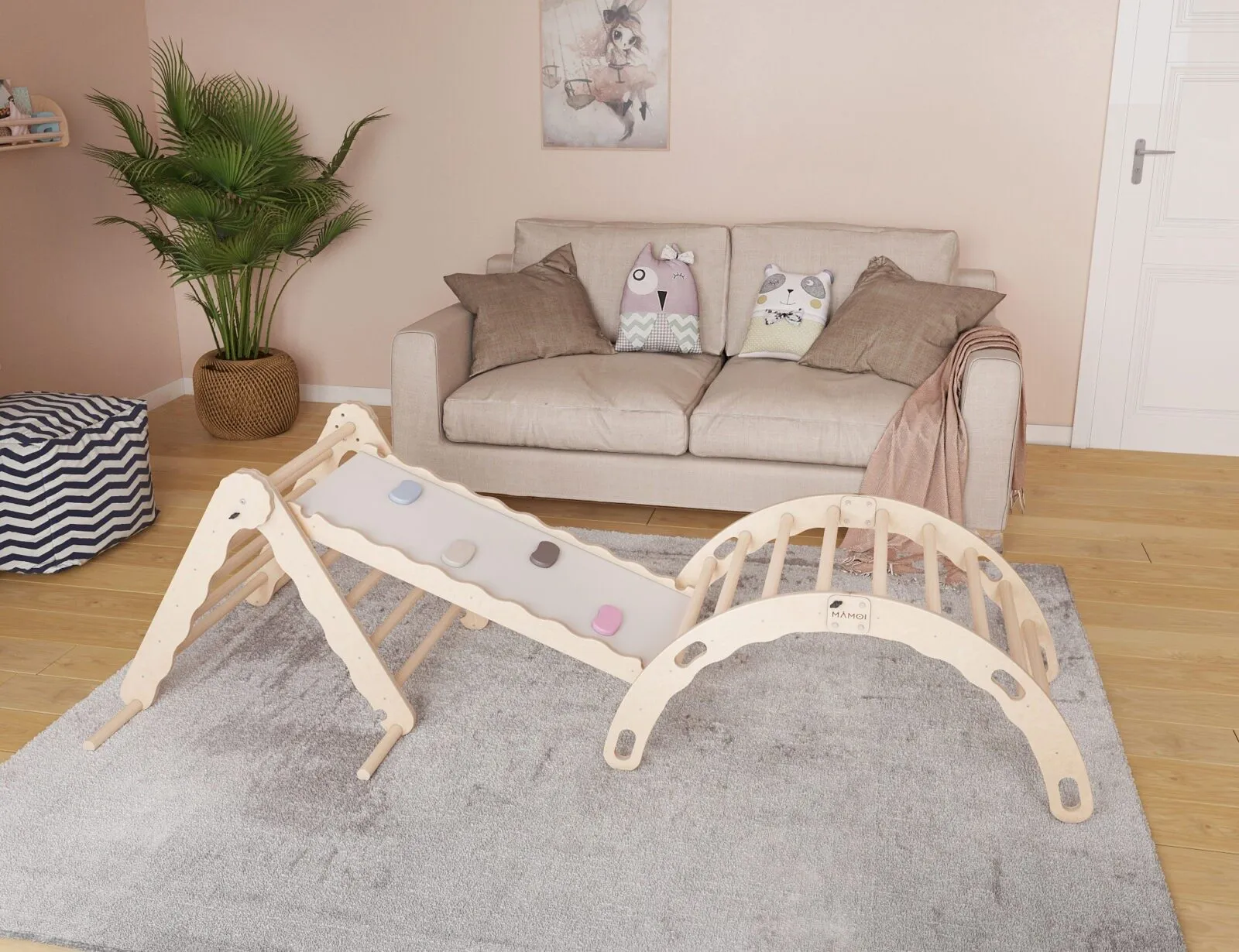 2. Arco arrampicata per bambini o sedia a dondolo di legno (giocattolo 2in1). Puntando l’arco verso l’alto si ottiene una coperta torre da arrampicata, e invece ruotando il giocattolo si può usarlo come una culla a dondolo. Il giocattolo è dotato di quattro maniglie con cui può essere facilmente spostato e dondolato. Il triangolo e il trapezio da arrampicata possono essere combinati con tappeti da gioco speciali.