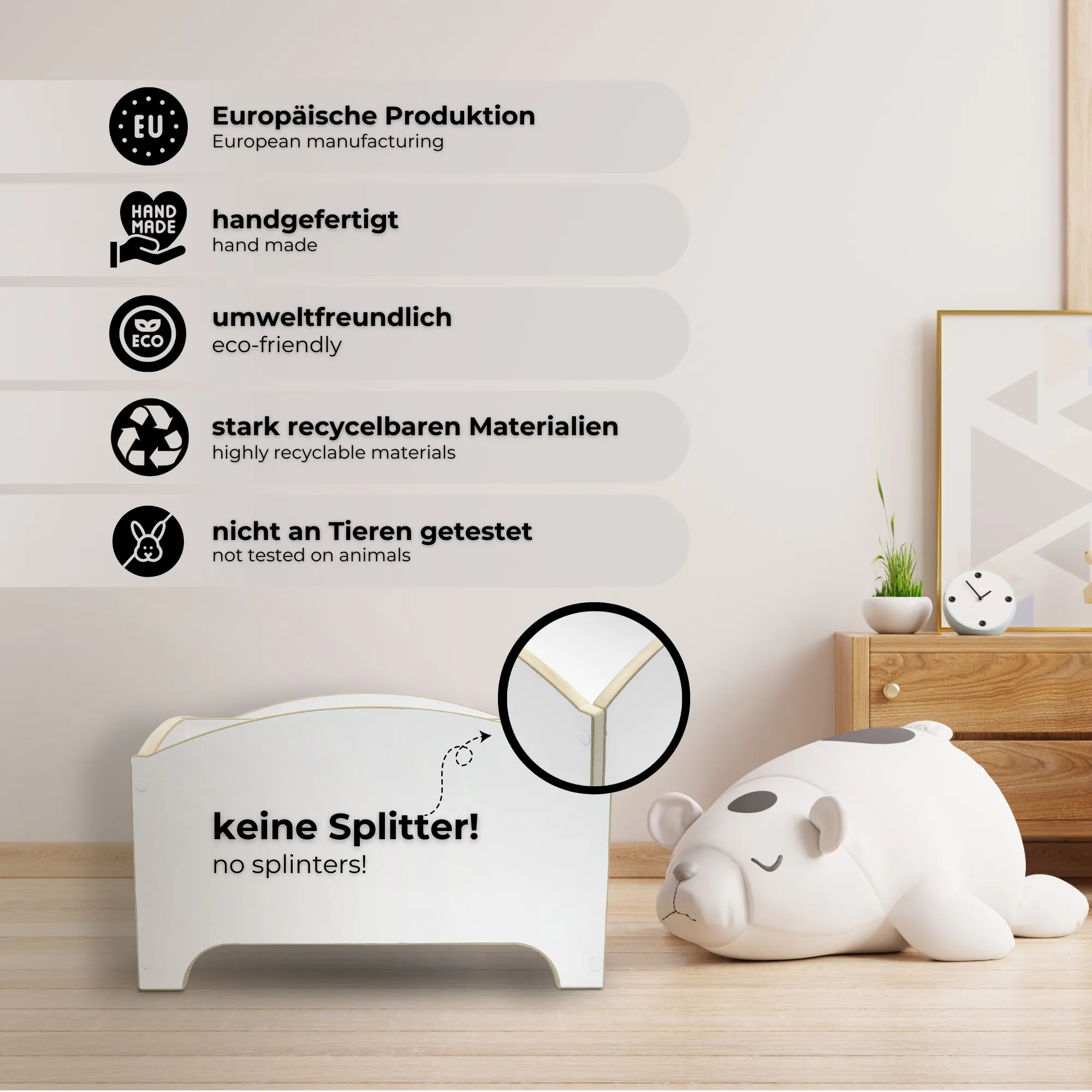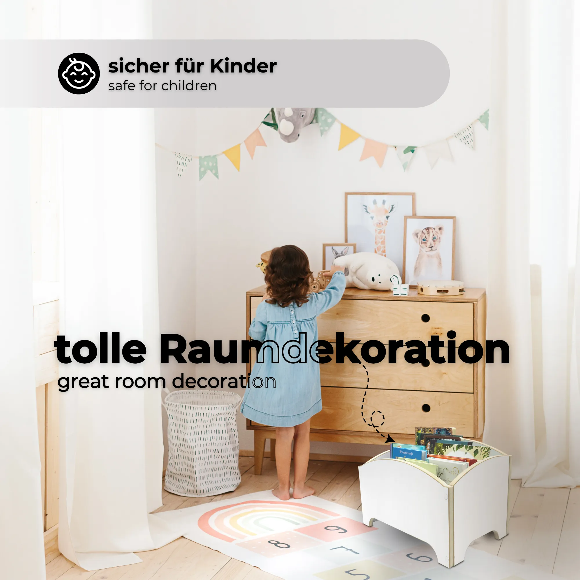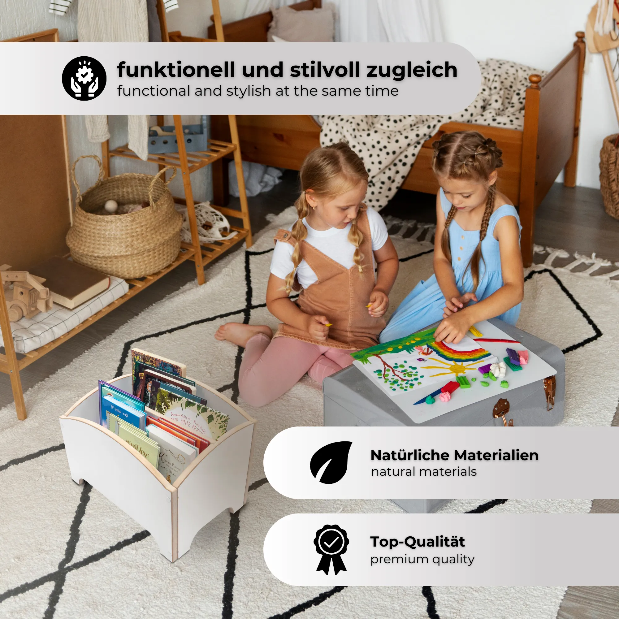 L’uso di legno robusto e di alta qualità non solo garantisce la longevità del prodotto, ma offre anche una soluzione di archiviazione ecologica. L’accurata lavorazione garantisce che lo scaffale resista facilmente alle esigenze quotidiane di bambini attivi.