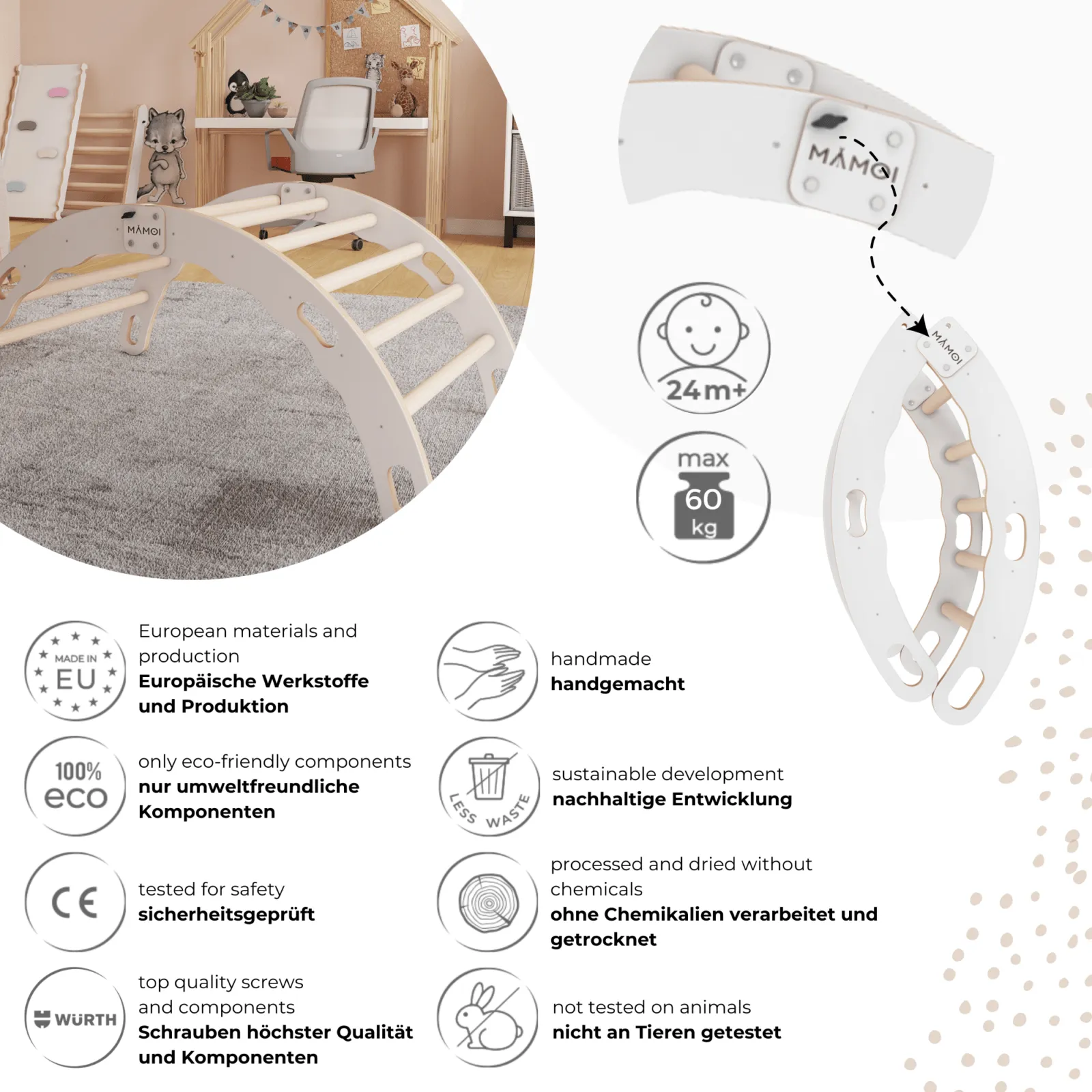 Drewniana kołyska dla dzieci wykonana jest z mocnej sklejki oraz maty pokrytej bawełnianym materiałem. Gwarantuje to wytrzymałość bujaka i bezpieczeństwo dla dziecka. Dodatkowe zabezpieczenie zapewnia miękka mata oraz zeszlifowane krawędzie. W zestawie znajduje się bujak, mata oraz elementy montażowe. Drewniana drabinka dla dzieci utrzyma maksymalne obciążenie do 60 kg. Jasno szara, bawełniana mata wraz z naturalnym drewnianym odcieniem bujaka nadaje estetycznego wyglądu. Idealnie dopasuje się do każdego wnętrza.