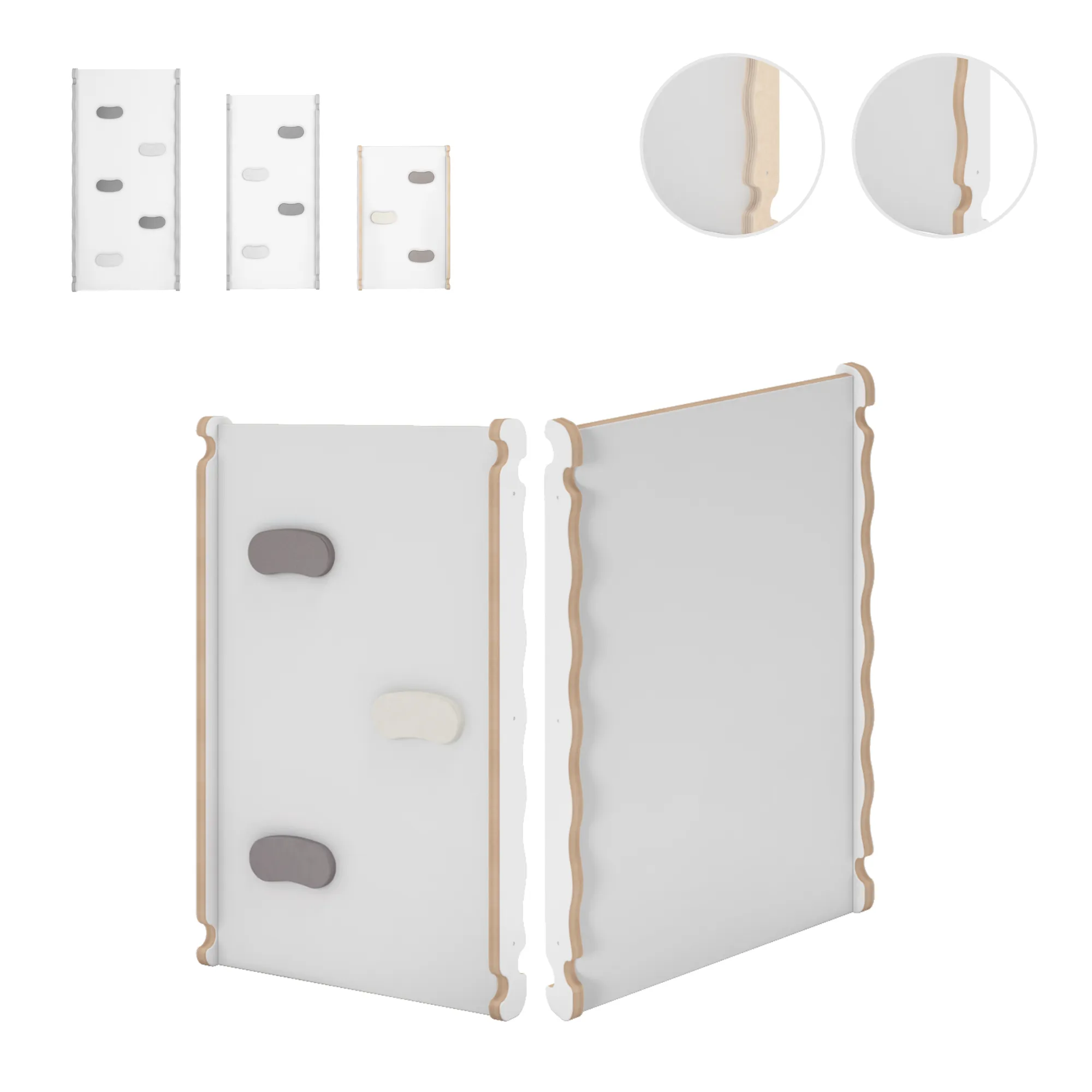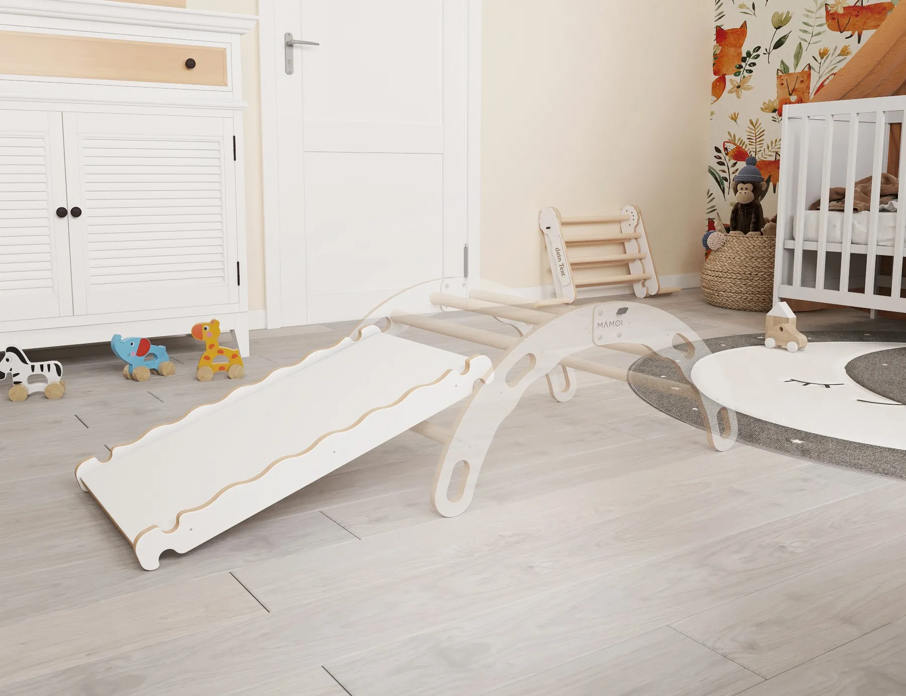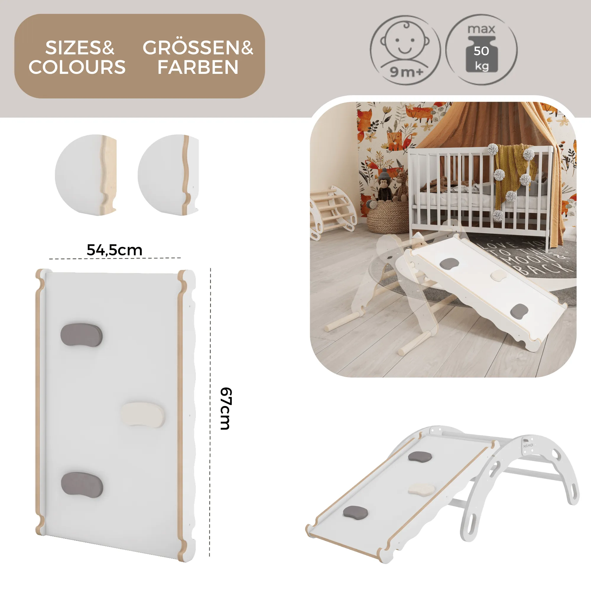 Zjeżdżalnia na drabince wspinaczkowej wykonana jest z Yarnwood w kolorze białym i wysokiej jakości sklejki ciętej metodą CNC. Dzięki temu każdy brzeg jest gładki i bezpieczny dla rączek dziecka. Drążki są wykonane z litego drewna bukowego. Deska ze sklejki posiada dwie strony: gładką oraz ze szczeblami. Wklejone w deskę drążki umożliwiają maluchowi wspinanie się i utrzymanie równowagi w czasie zabawy. Z obu stron zjeżdżalnia posiada nawierty do mocowania zjeżdżalni. Brzeg deski z jednej strony jest wycięty w kształt fali, co zapewnia stabilność przy łączeniu zjeżdżalni z innymi zabawkami.