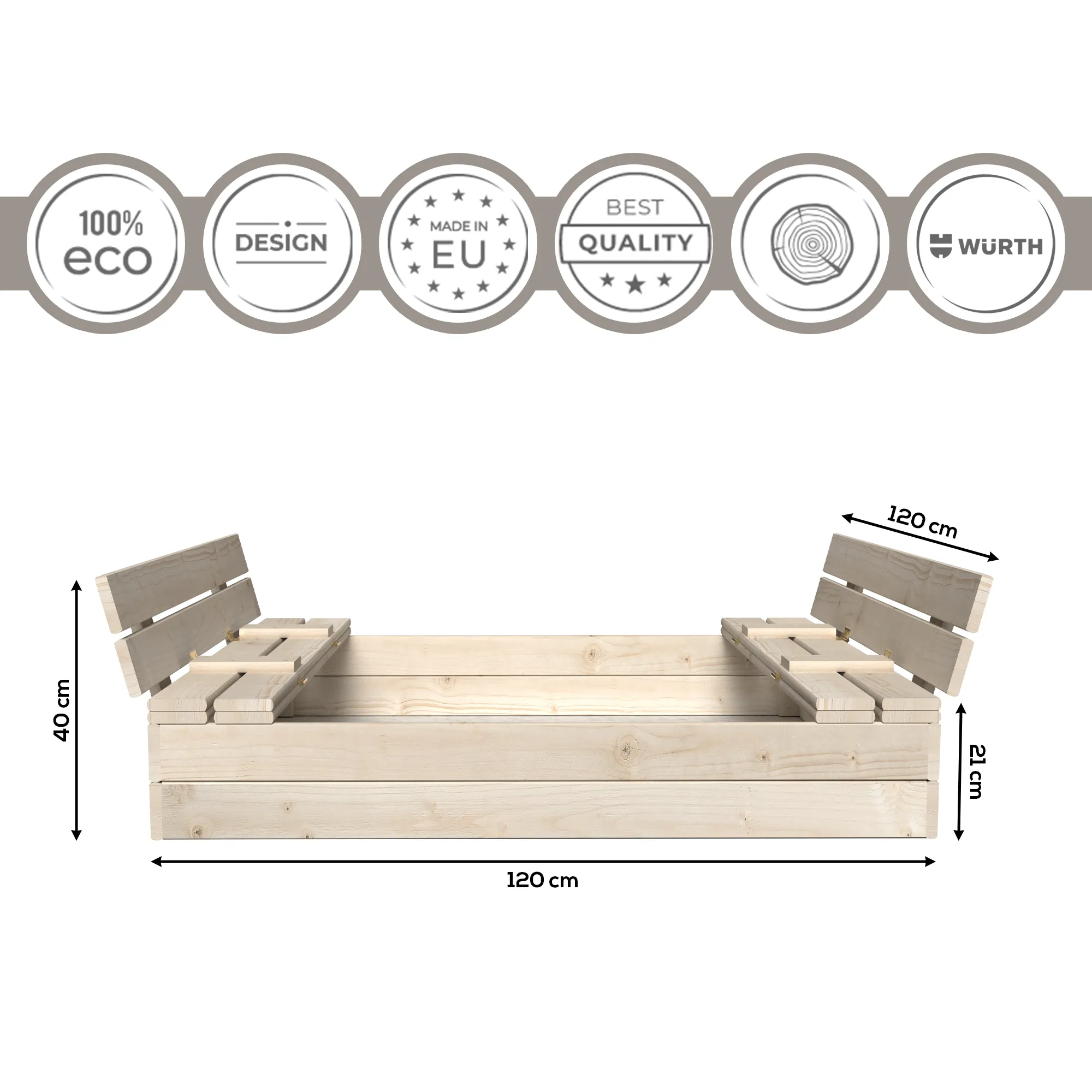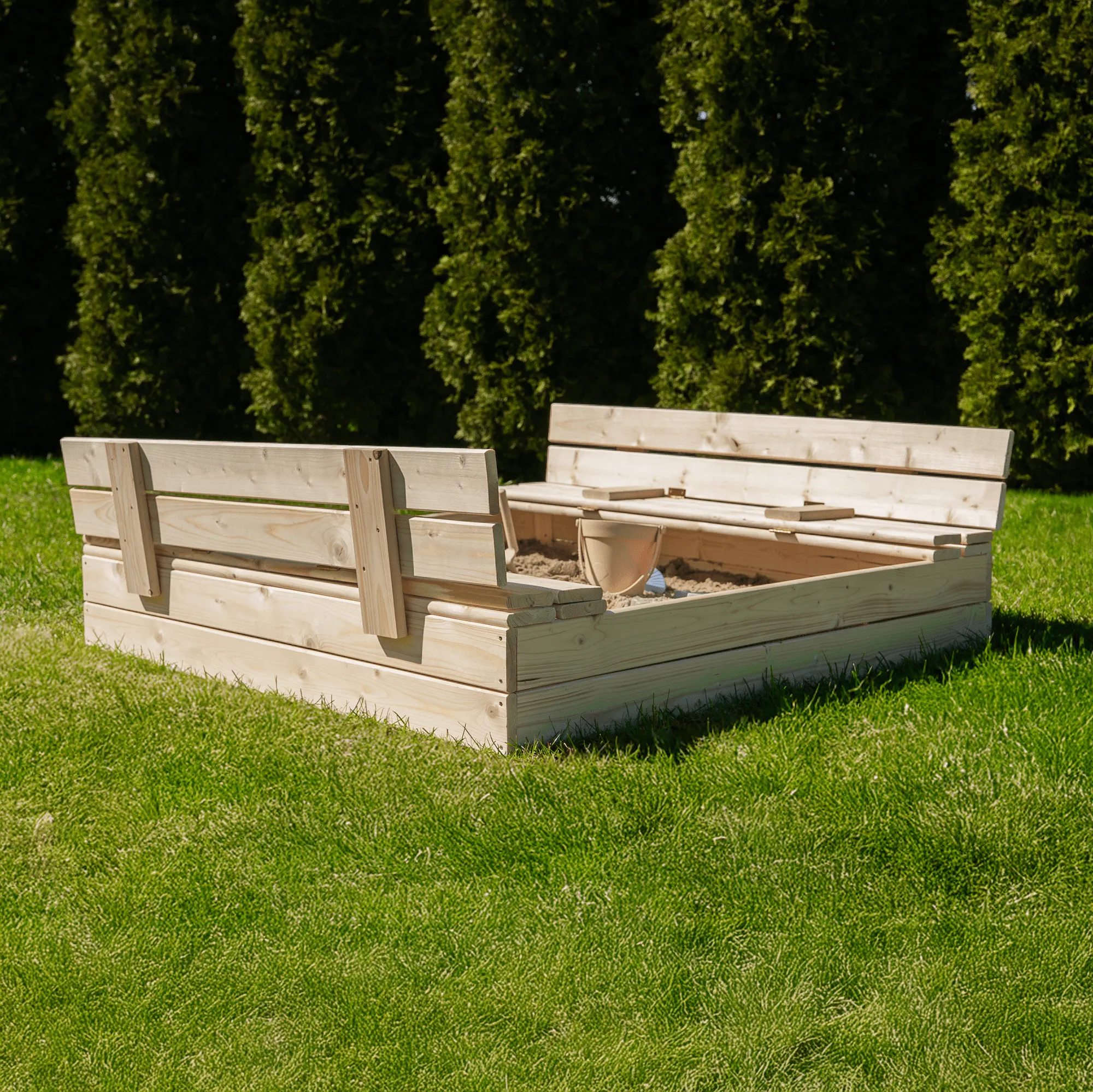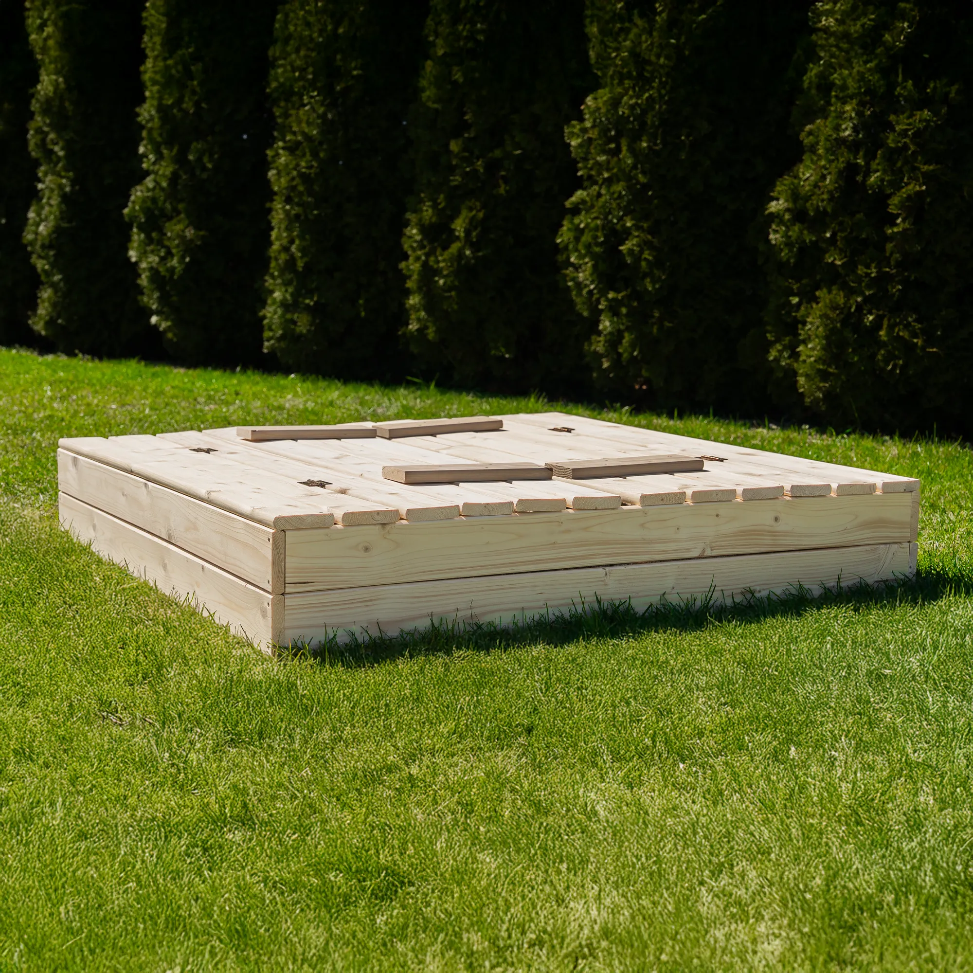 È realizzato in legno di pino secco e di alta qualità. Per garantire la sicurezza dei vostri bambini, i bordi delle assi della sabbiera sono arrotondati e la superficie è accuratamente piallata e levigata. La sabbiera rappresenta un luogo di gioco sicuro per i bambini. È dotata di due panchine richiudibili che, una volta chiuse, proteggono la sabbia dall’ingresso di animali, foglie, sporcizia o altre contaminazioni indesiderate.
