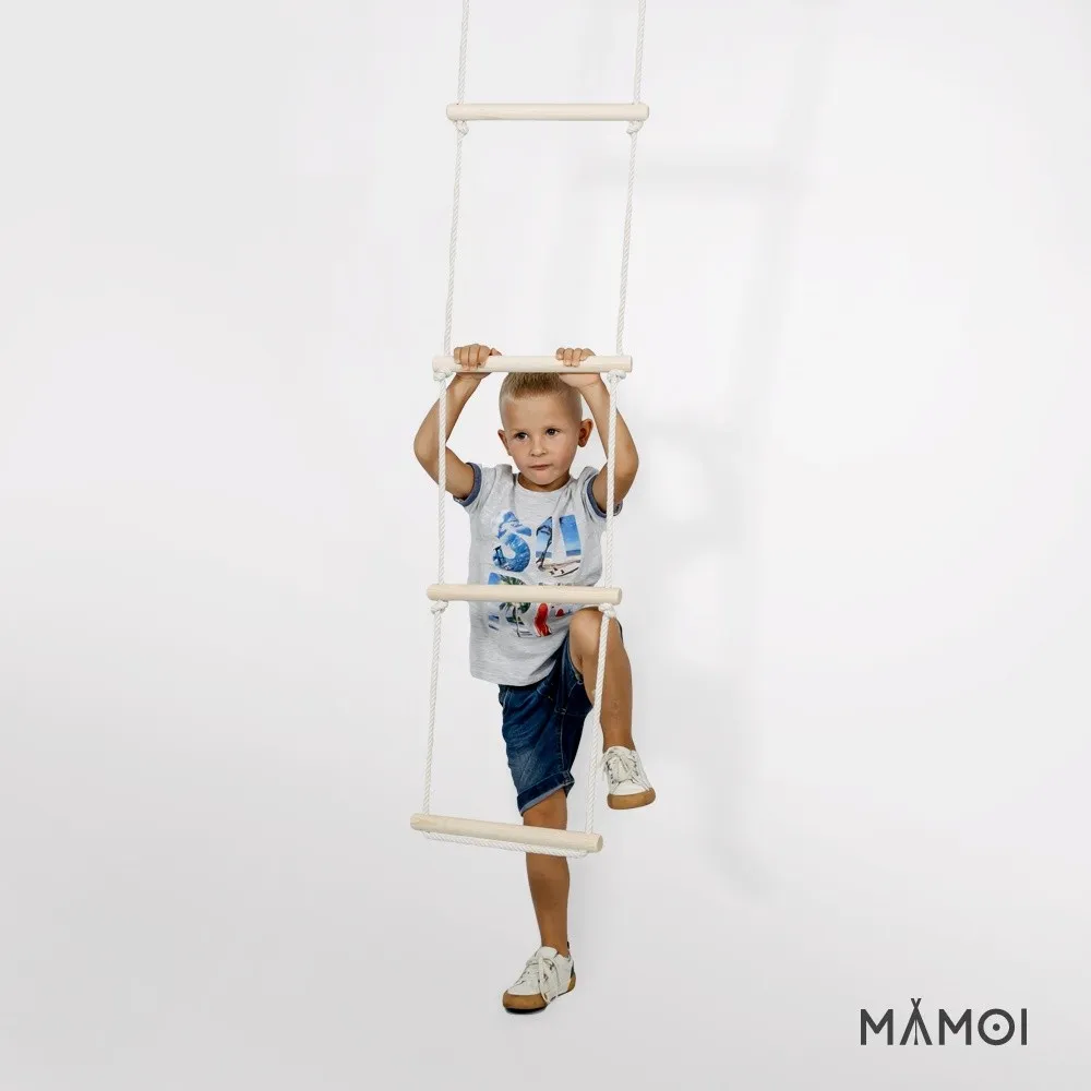 La scala di corda di MAMOI è intesa come supplemento ad altri prodotti MAMOI, come la parete a pioli. Il prodotto garantisce sicurezza e massimo comfort durante il gioco. I pioli sono realizzati in legno naturale e sono collegati con corde nautiche in cotone solido (diametro di 10 mm). Il montaggio della scala sospesa per bambini è davvero semplice. Le funi sono fissate con fascette metalliche e la scala può essere appesa tramite un moschettone. La scala sospesa è pronta per l’uso. Giocare sulla scala supporta la coordinazione motoria di un bambino e il corretto sviluppo dei suoi muscoli.
