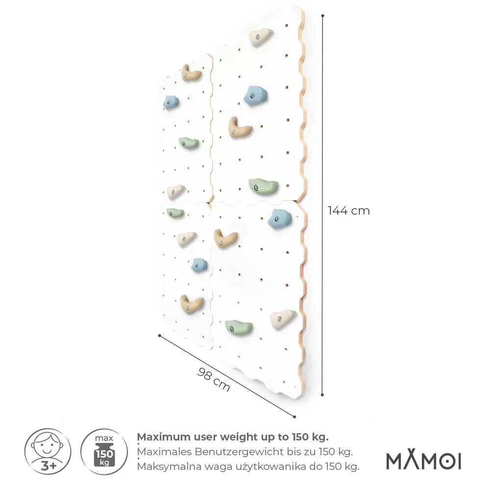Zabawki MAMOI wspierają prawidłowy rozwój psychoruchowy dziecka. Mur escalade enfant interieur umożliwia rozwijać zręczność oraz siłę mięśni. Produkt wykonany jest z wysokiej jakości, atestowanych materiałów, które zapewniają bezpieczeństwo w czasie zabawy. Moduły mur escalade powstały z ekologicznego Yarnwood. Wszystkie elementy są dokładnie wycinane metodą CNC i szlifowane. Produkt przeznaczony jest do samodzielnego montażu przy pomocy dołączonych do zestawu elementów.