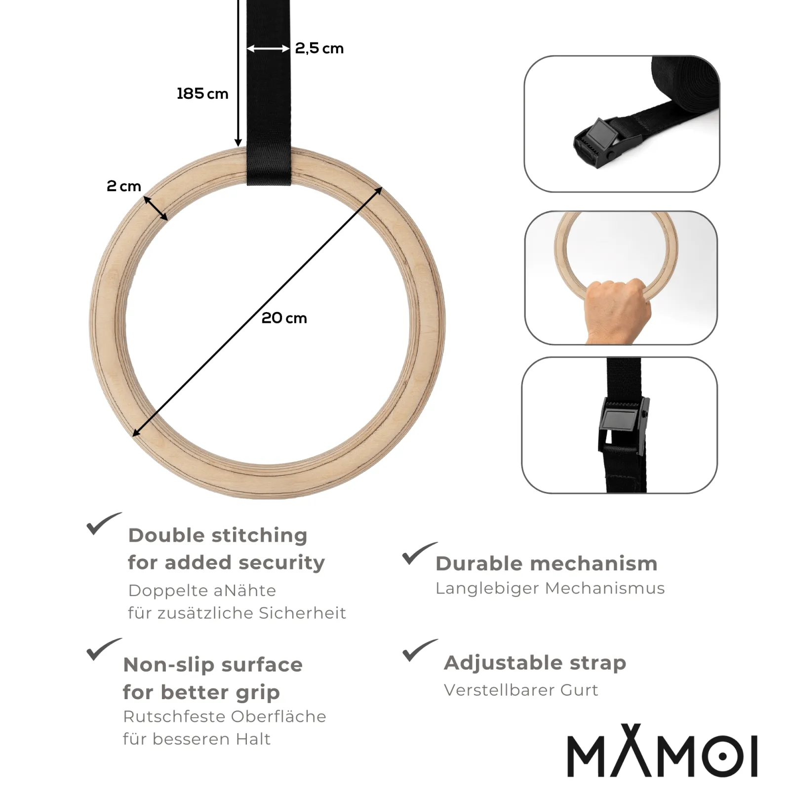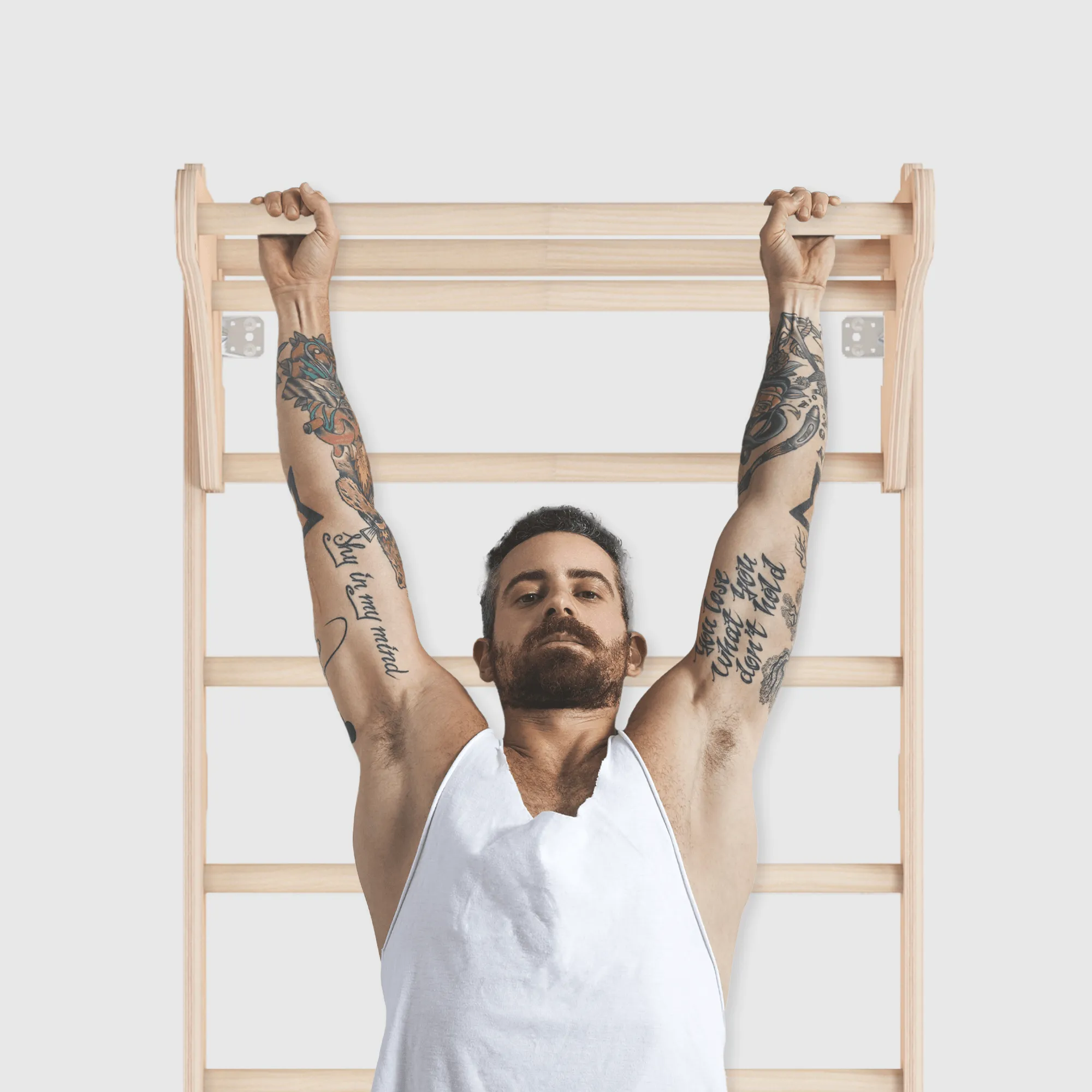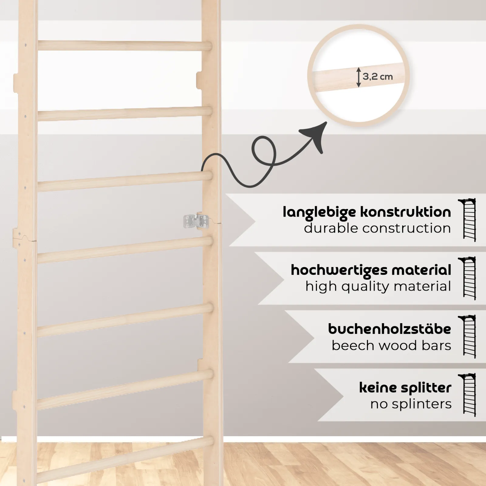 Die Sprossenwand mit verstellbaren Turnringen ist ein multifunktionales Trainingsgerät für den Heimgebrauch. Sie kombiniert effektive Trainingseinheiten mit stilvollem Design und passt sich perfekt jeder Wohnumgebung an. Dank der Wandmontage spart sie Platz, ohne dabei an Funktionalität einzubüßen. Gefertigt aus hochwertigem Naturholz, garantiert sie Stabilität und Sicherheit – selbst bei intensivem Training. Die im Set enthaltenen Turnringe bestehen aus Holz und lassen sich in der Länge individuell anpassen. Dadurch eignet sich das Gerät für Nutzer unterschiedlicher Größe und Trainingsniveaus – von Anfänger bis Fortgeschrittene. Es ermöglicht eine Vielzahl an Übungen: Klimmzüge, Beinheben, Dehnübungen und Mobilitätsarbeit – ideal zur Stärkung des gesamten Körpers. Durch ihren universellen Charakter ist die Sprossenwand nicht nur für Erwachsene, sondern auch für Kinder unter Aufsicht geeignet. Sie unterstützt den Aufbau von Kraft, Koordination und Beweglichkeit. Ob als Ergänzung für das Home-Gym, zur Mobilisation im Büro oder als Bewegungsspielplatz im Kinderzimmer – dieses Produkt bringt mehr Aktivität in den Alltag. Das natürliche Design fügt sich harmonisch in verschiedene Einrichtungsstile ein – von modern bis klassisch. Neben ihrer Funktionalität überzeugt die Sprossenwand auch optisch als hochwertiger Bestandteil der Wohnungseinrichtung. Sie ist eine sinnvolle Investition in Gesundheit, Wohlbefinden und gemeinsame Zeit mit der Familie – im sicheren und vertrauten Umfeld des eigenen Zuhauses.