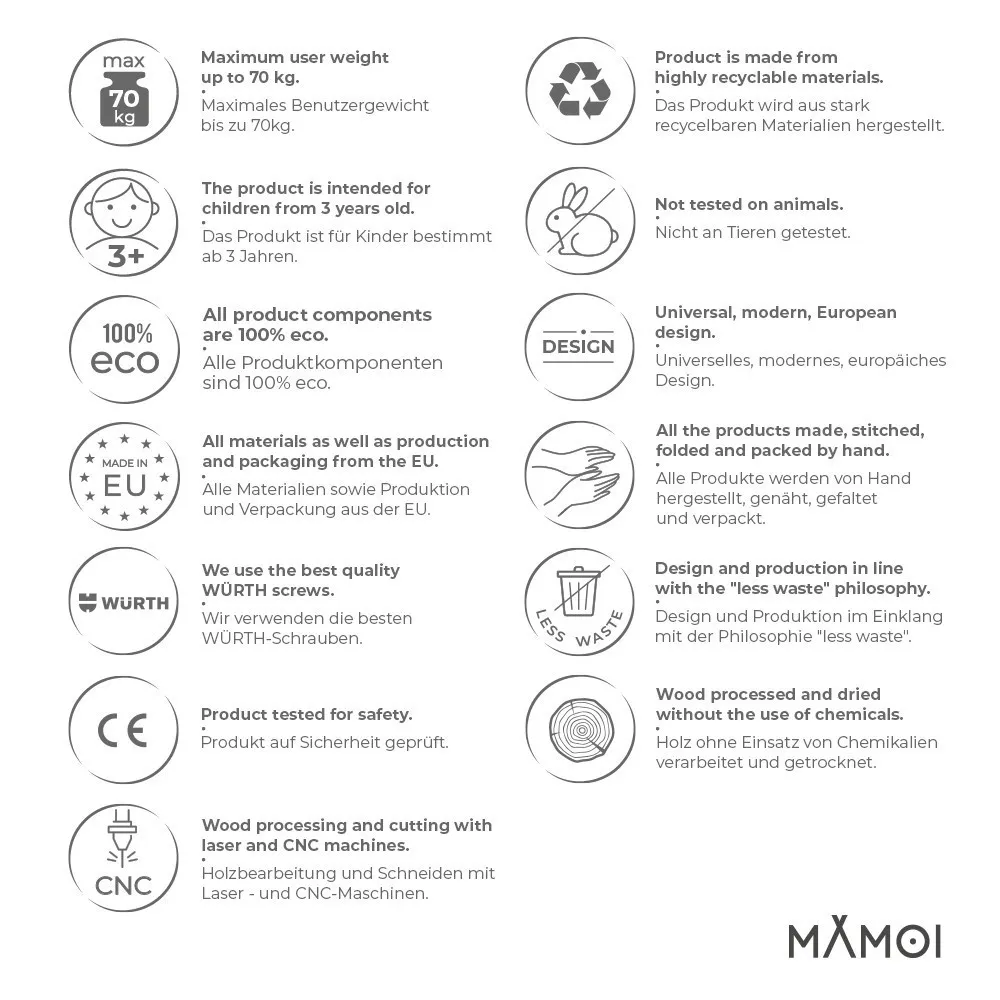 “La presa per una scaletta si distingue per la sua rifinitura e forma moderna. Le trazioni alla sbarra aiutano a rafforzare i muscoli del bambino e sostiene lo sviluppo piscomotorio corretto. La presa è compatibile con una scaletta d’arrampicata di MAMOI. Grazie alla struttura robusta, la presa per scaletta può sostenere il peso fino a 70 kg. Il prodotto soddisfa i severi requisiti della sicurezza EN e CE.