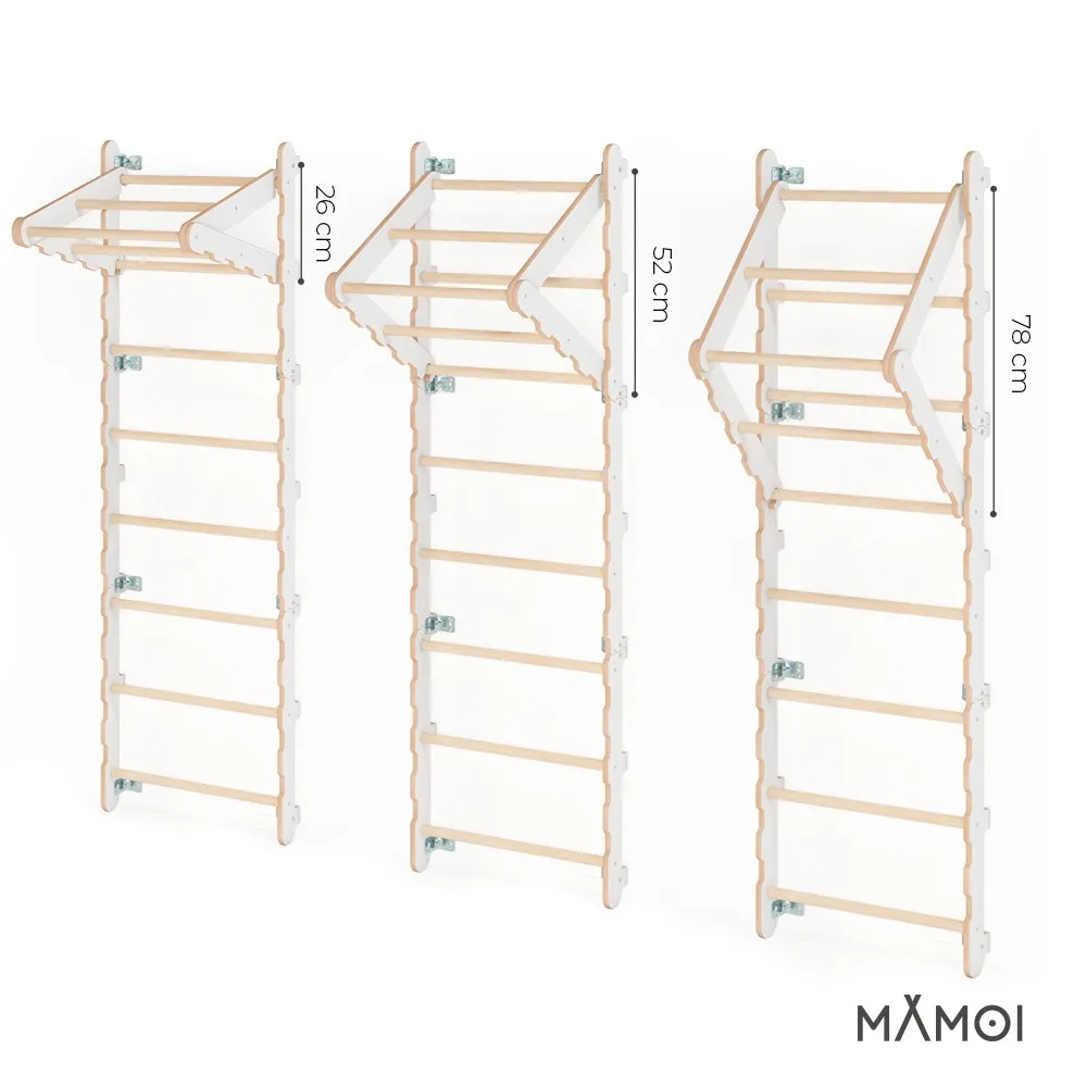 La sbarra per trazioni viene realizzato in Yarnwood ecologico e nelle sbarre del legno naturale di faggio. Gli elementi della struttura sono precisamente levigati, in modo che non ci siano delle schegge o bave. I bordi sono stati realizzati in Yarnwood di colore bianco, poi decorati con i ritagli decorativi. La scaletta è decorata con i colori neutri che si adatta ad ogni arredamento. Il giocattolo è rispettoso all’ambiente e sicuro per i bambini. La lubrificazione ecologica viene utilizzata nel processo di produzione.