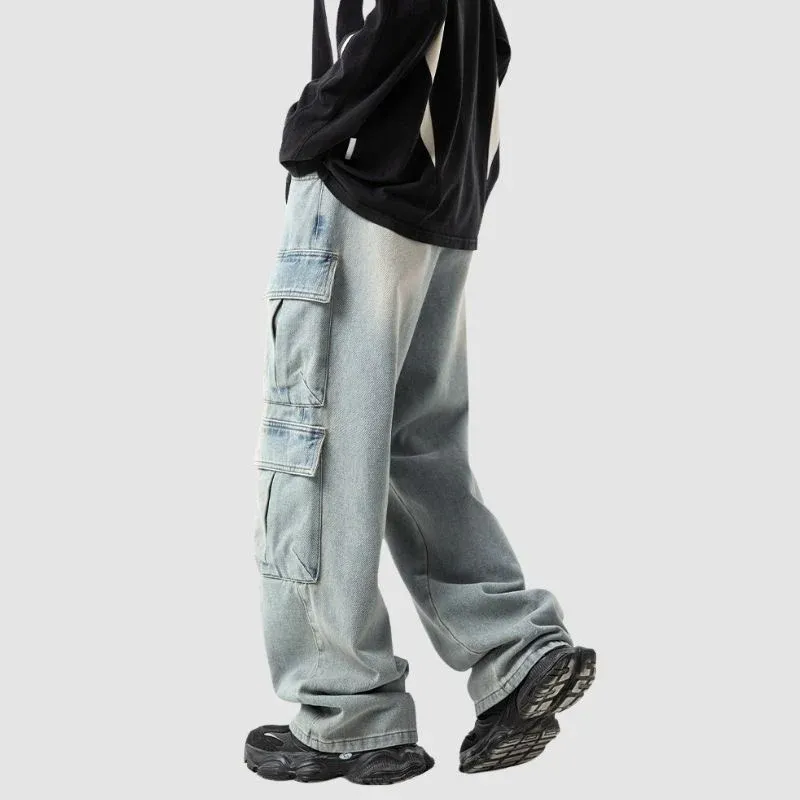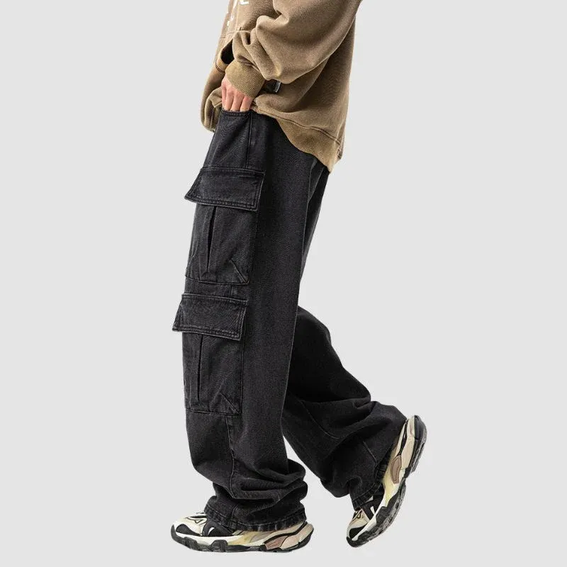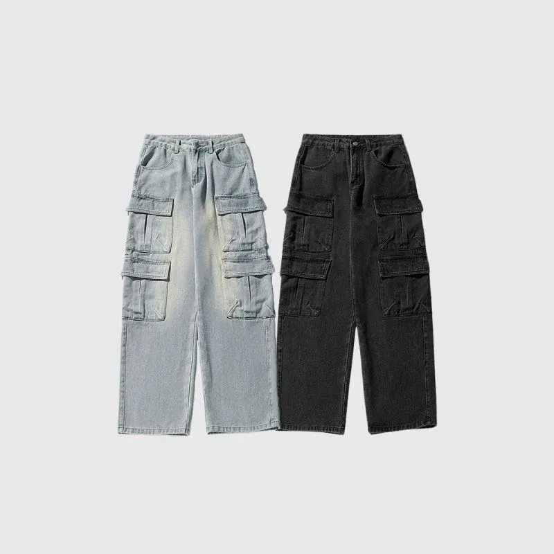 Features: Pants, jeans, cargo pants, vintage, washed, multi-pocket, slightly stretchy, zipper front, solid color, straight-leg, relaxed fit, unisex, couple outfits.