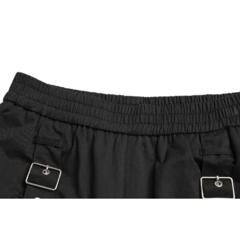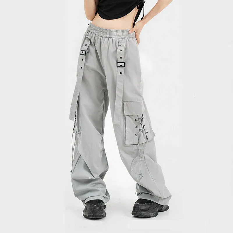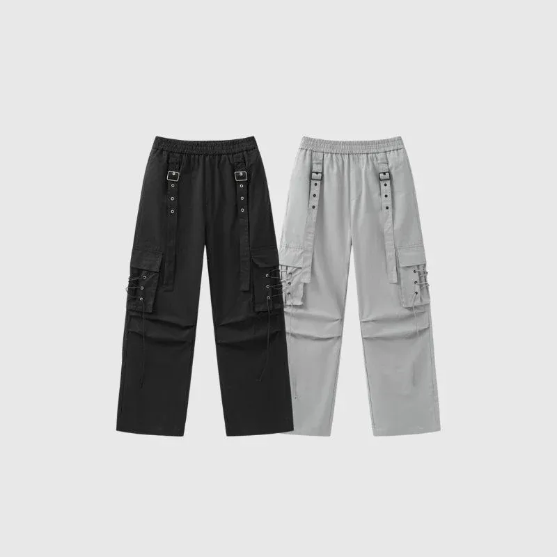 Features: Pants, cargo pants, wide leg, solid color, button ribbon design, drawstring pocket decoration, elastic waist, straight-leg, relaxed fit, unisex, couple outfits.