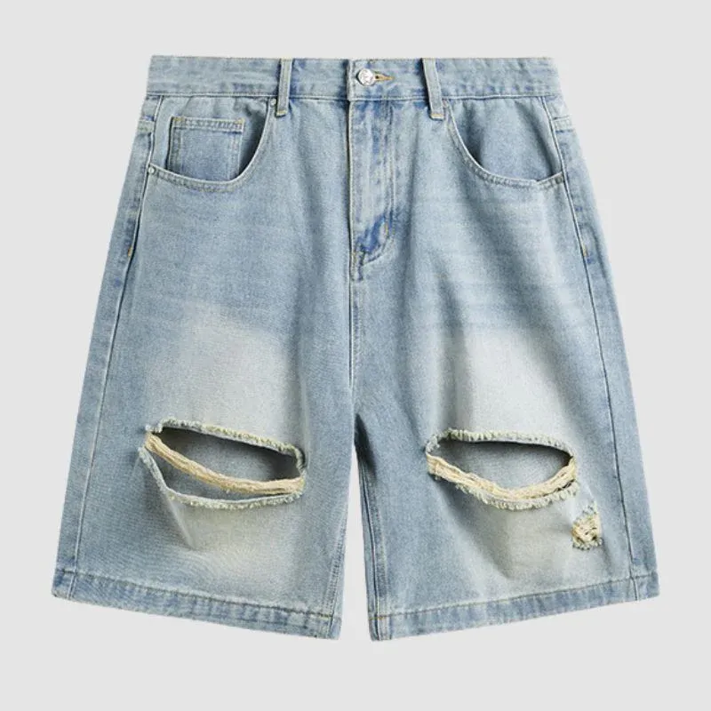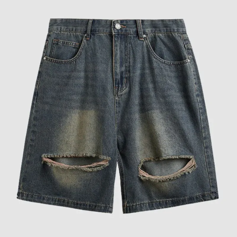 Features: Shorts, scratched ripped denim, drawstring waist, solid color, straight-leg, relaxed fit, unisex, couple outfits.