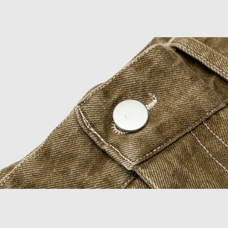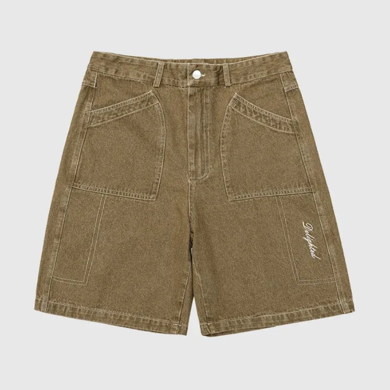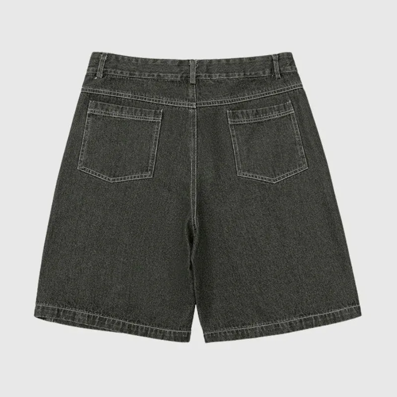 Features: Jorts, side embroidered design, washed, distressed, zipper front, solid color, vintage, side pocket, straight-leg, relaxed fit, unisex, couple outfits.