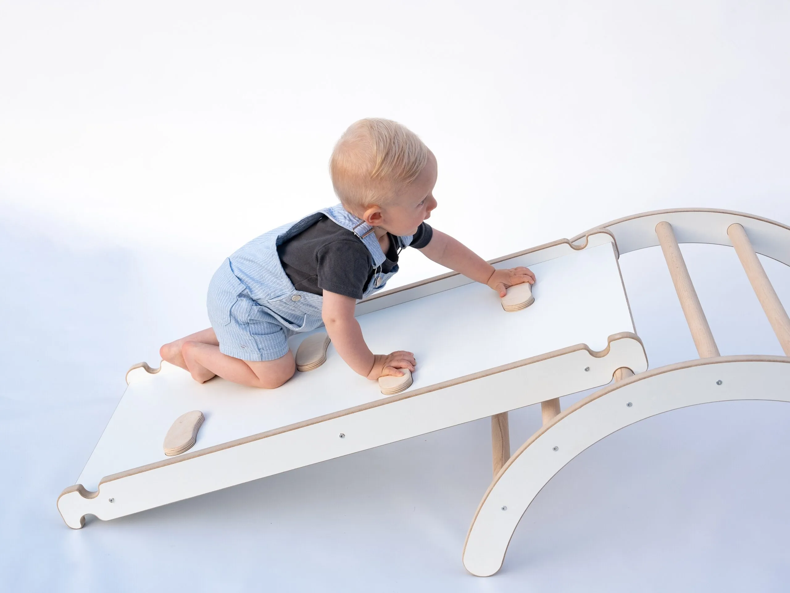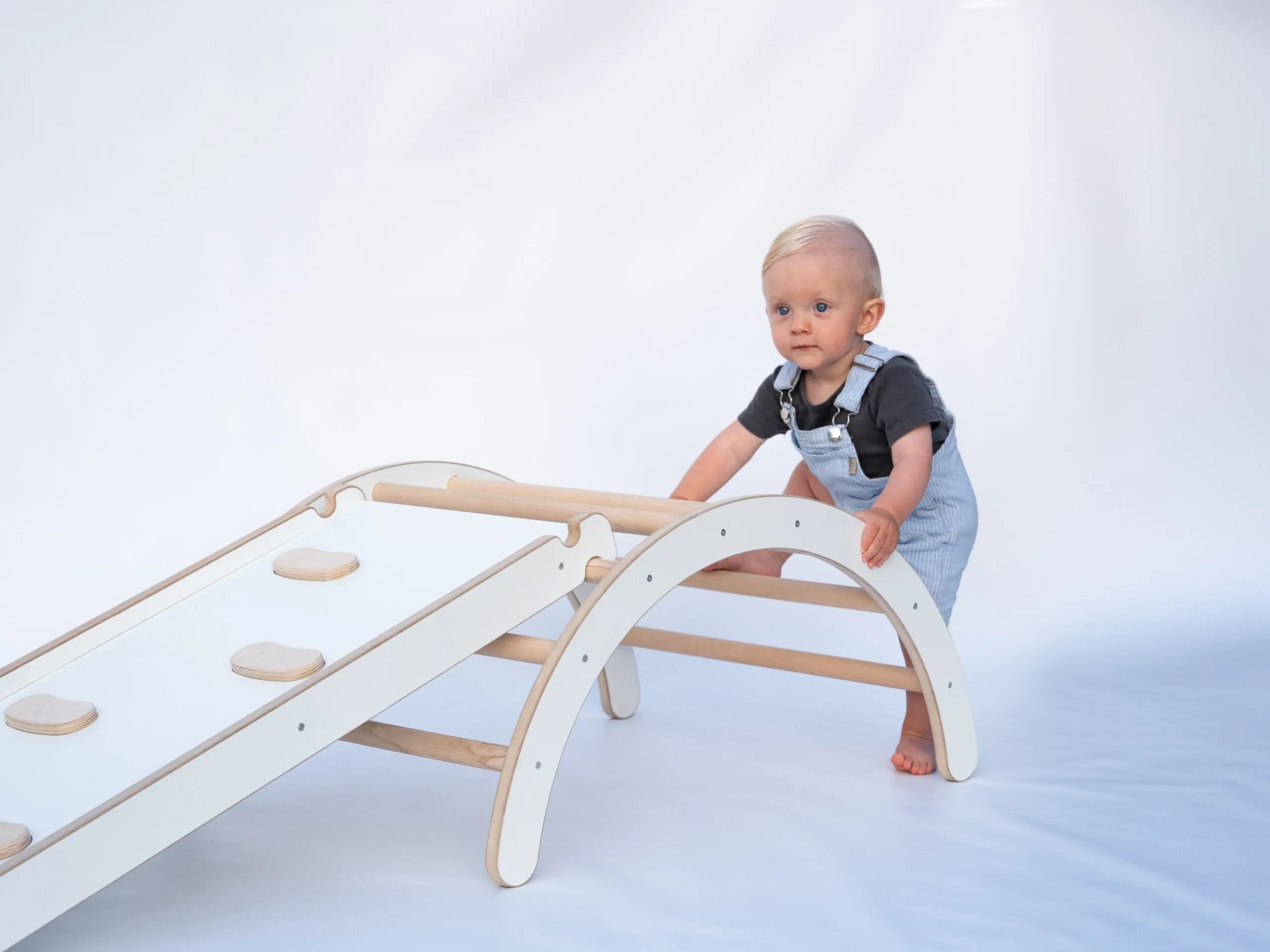 Proponujemy zestaw: trójkąt wspinaczkowy, bujak oraz drewniana zjeżdżalnia, wykonane z płyty kompozytowej (wykończona Yarnwood w kolorze białym) i sklejki, ciętej metodą CNC. Drążki powstały z drewna bukowego. Produkt spełnia wszystkie rygorystyczne europejskie normy jakości. Jest w pełni bezpieczny dla dzieci oraz zachwyca wyjątkową trwałością. Zestaw dedykowany jest dla maluchów powyżej 24 miesiący oraz starszych dzieci.