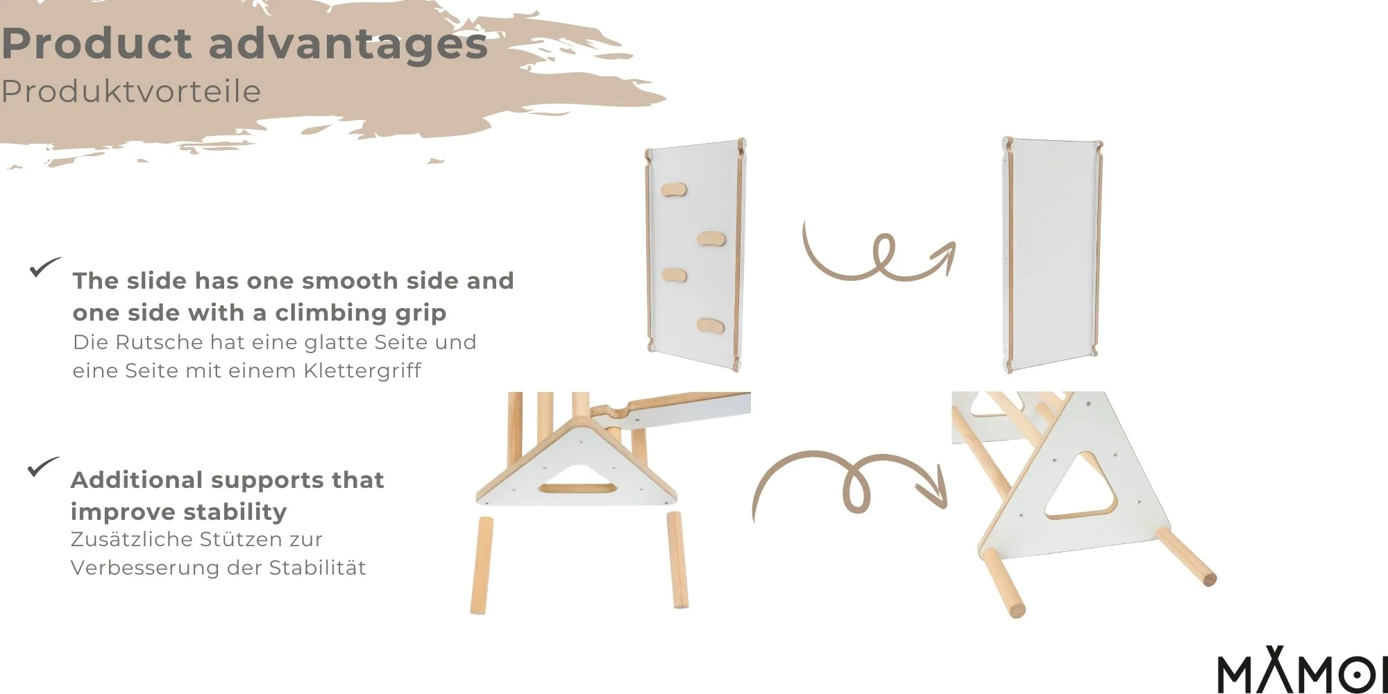 Trójkąt wspinaczkowy i zjeżdżalnię można łączyć ze specjalnymi matami do zabawy. Wspinanie po szczebelkach wspiera rozwój psychoruchowy dziecka oraz prawidłowy rozwój mięśni dziecka! Produkt może być stosowany na zewnątrz, ale powinien być przechowywany w suchym i czystym miejscu. Ze względu na naturalne materiały, nie może być narażony na działanie niekorzystnych warunków atmosferycznych, takich jak deszcz czy śnieg. Producent nie ponosi odpowiedzialności za nieprzestrzeganie warunków przechowywania zawartych w instrukcji zabawek.